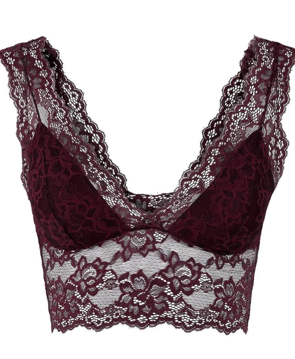 Blondebh fra Pieces i en dyb bordeauxrød farve. Bh’en har et blomstret blondemønster og en størrelsessvarende pasform med god komfort.