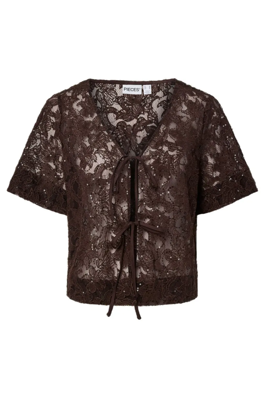Brun top fra Pieces i gennemsigtig blonde med V-hals og bindebånd. Toppen har pailletter og et blomstret mønster.