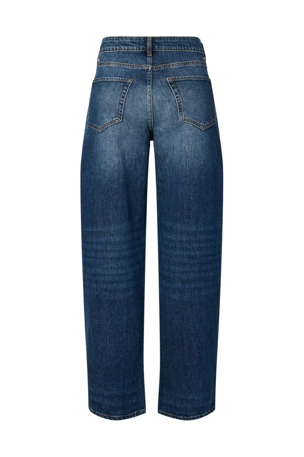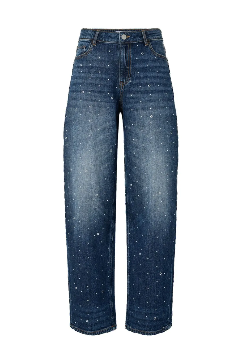 Mørkeblå jeans fra Pieces med barrel-fit og polkaprikket mønster. Jeansene har perledetaljer på forsiden og klassiske lommer både foran og bagpå, samt knap- og lynlåslukning.