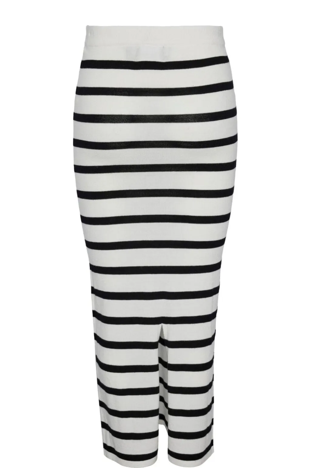 Stribet ankelskørt fra Pieces med vandrette sorte og hvide striber. Skørtet har en regular fit og elastik i taljen for god bevægelsesfrihed.