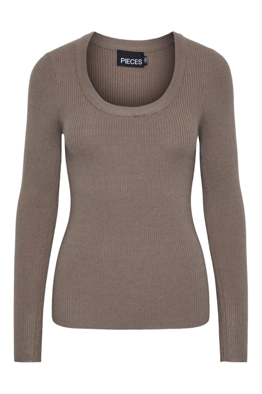 Brun strikbluse fra Pieces i ribstrik med U-halsudskæring og lange ærmer. Toppen har en tætsiddende pasform med synlige ribber på både for- og bagside.