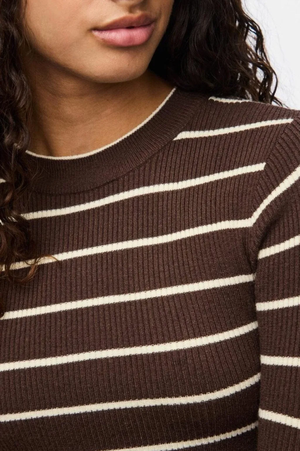 Mørkebrun strikbluse med vandrette striber i creme. Den tætsiddende model har ribstrik på både for- og bagside samt rund halsudskæring.