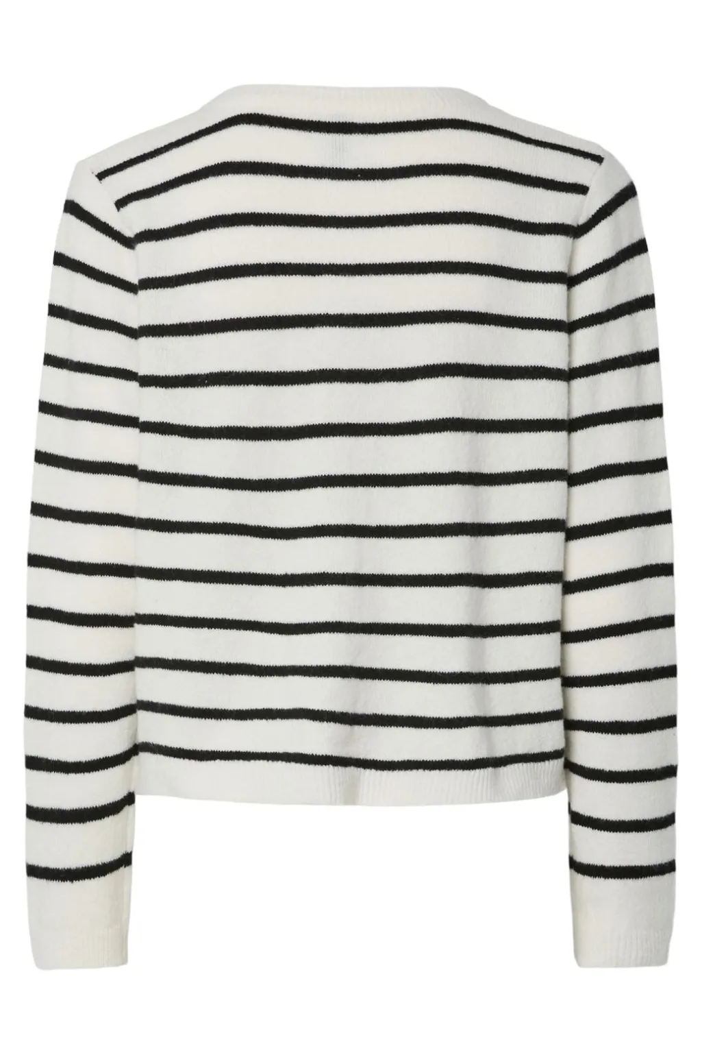 Stribet cardigan fra Pieces med hvid base og sorte striber. Cardiganen har en rund halsudskæring, lange ærmer og lukkes med knapper hele vejen ned.