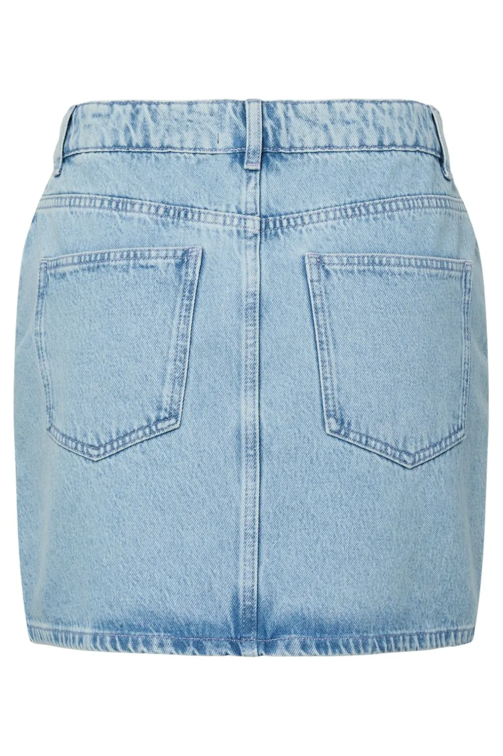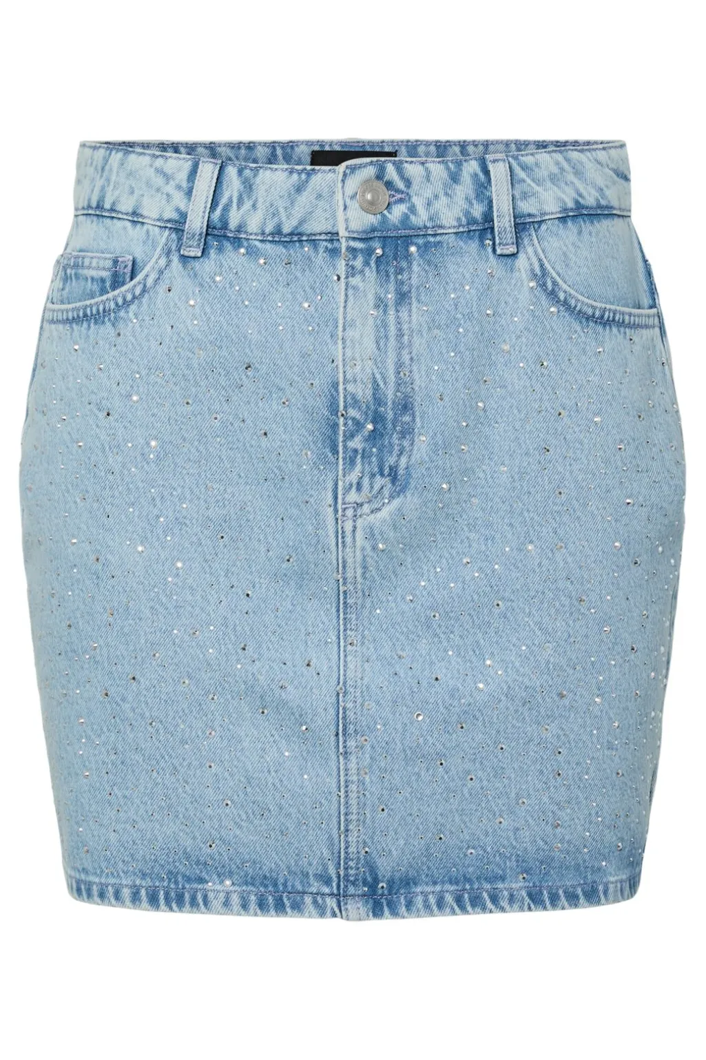 Kort denimnederdel fra Pieces i lyseblå denim med rhinsten-dekoration. Nederdelen har en mellemhøj talje og er pyntet med skinnende rhinsten på forsiden.