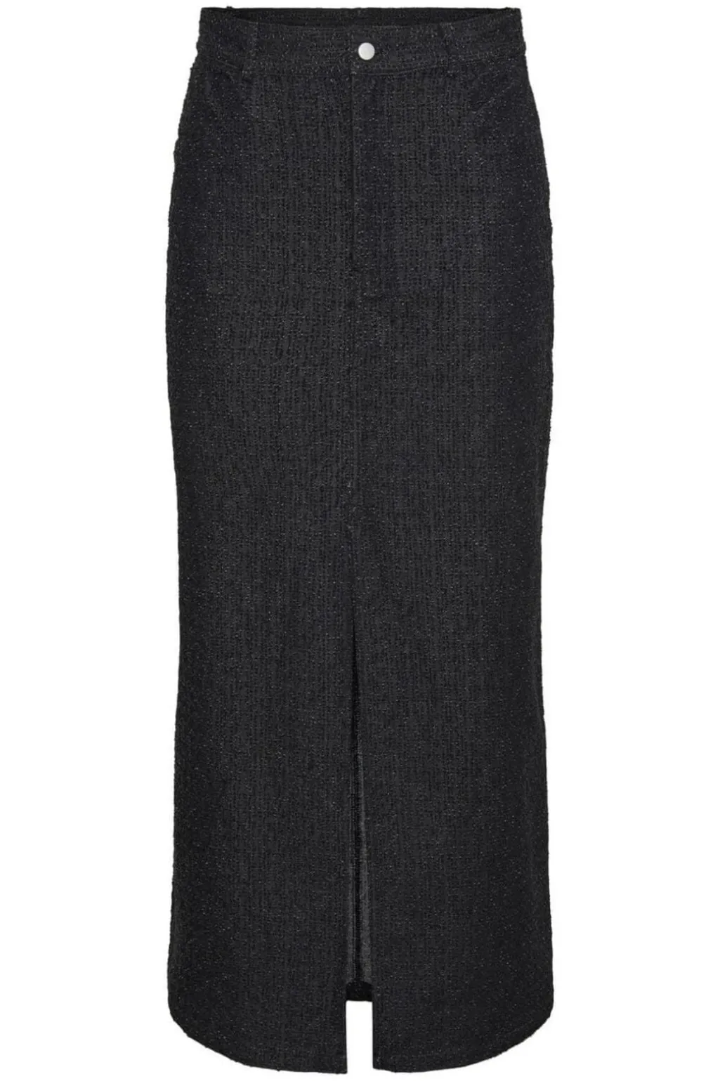 Lang nederdel fra Pieces i mørkegrå denim med frontslids. Nederdelen har en klassisk pasform med regulær talje og knaplukning foran.