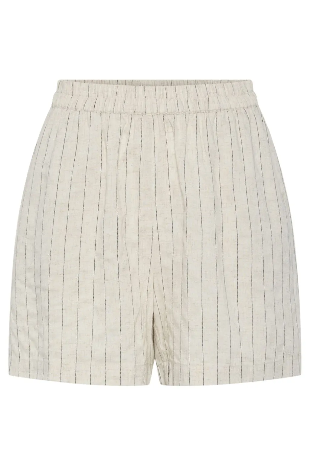 Stribede shorts fra Pieces i en lys beige nuance med tynde mørke linjer. Shortsene har en loose fit-pasform og kommer i lårlængde med elastisk talje og flæsedetaljer.