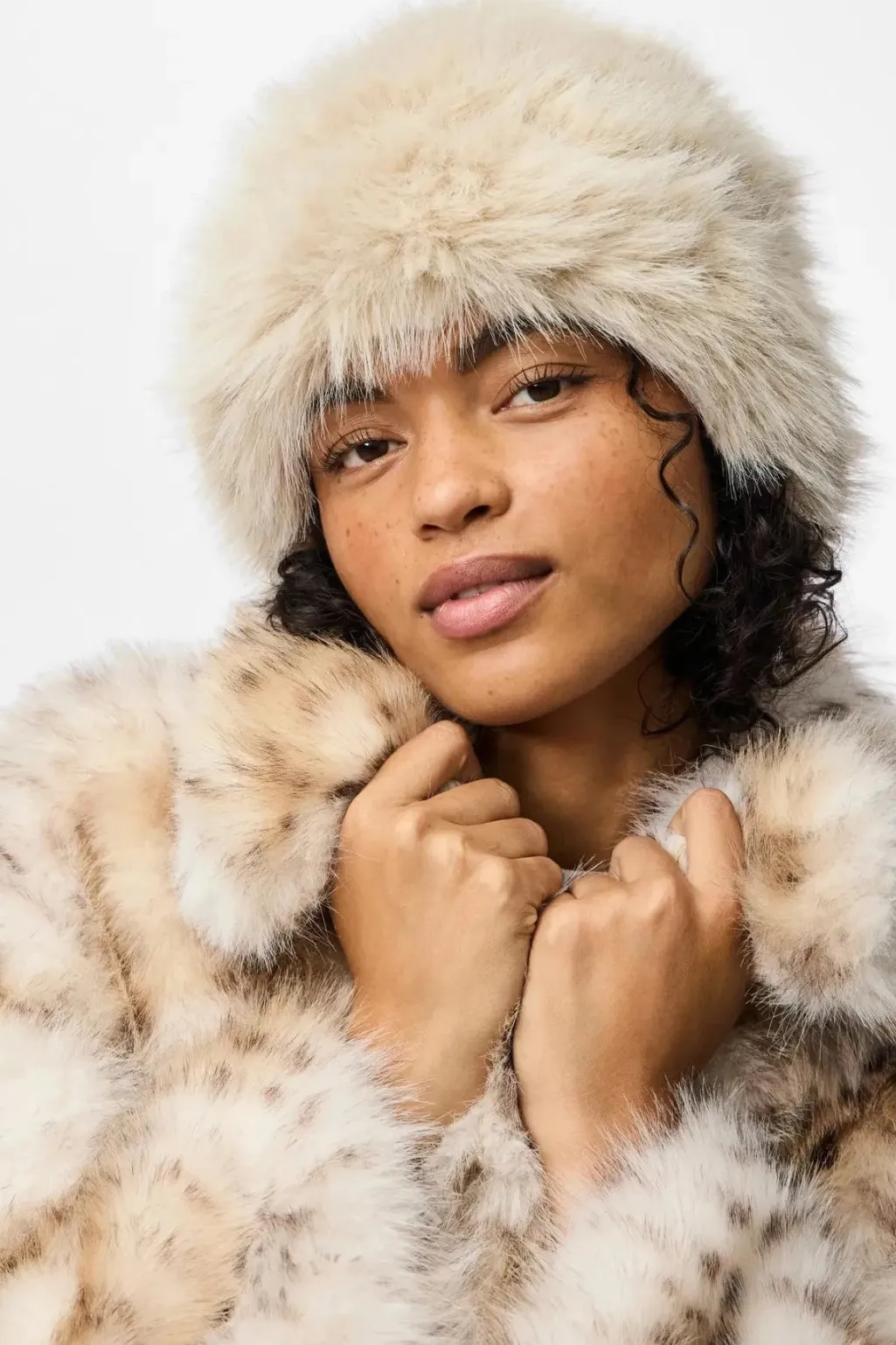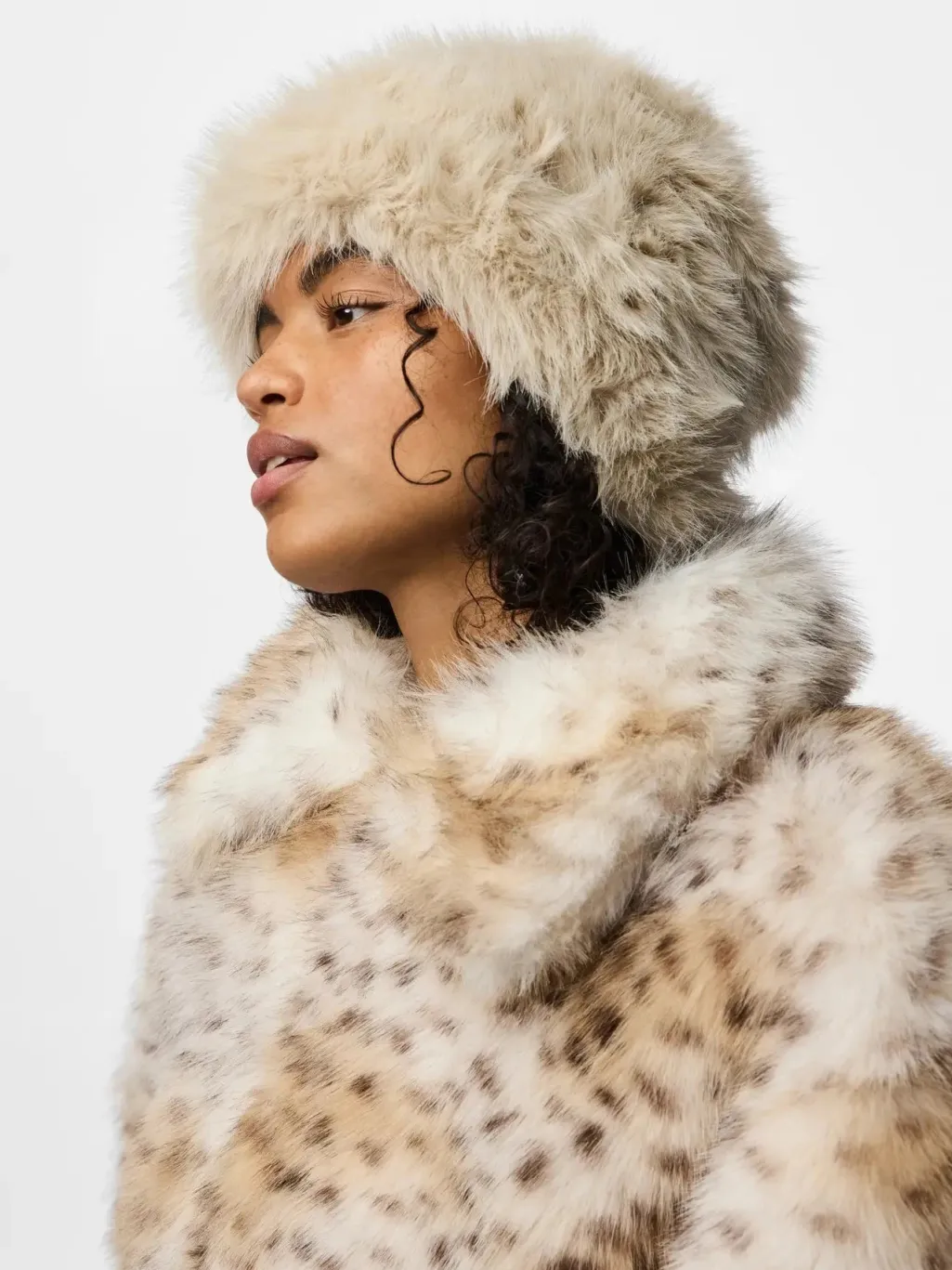 En fluffy hat fra Pieces i lys beige. Hatten har et voluminøst design med en rund form, der dækker hovedet helt.