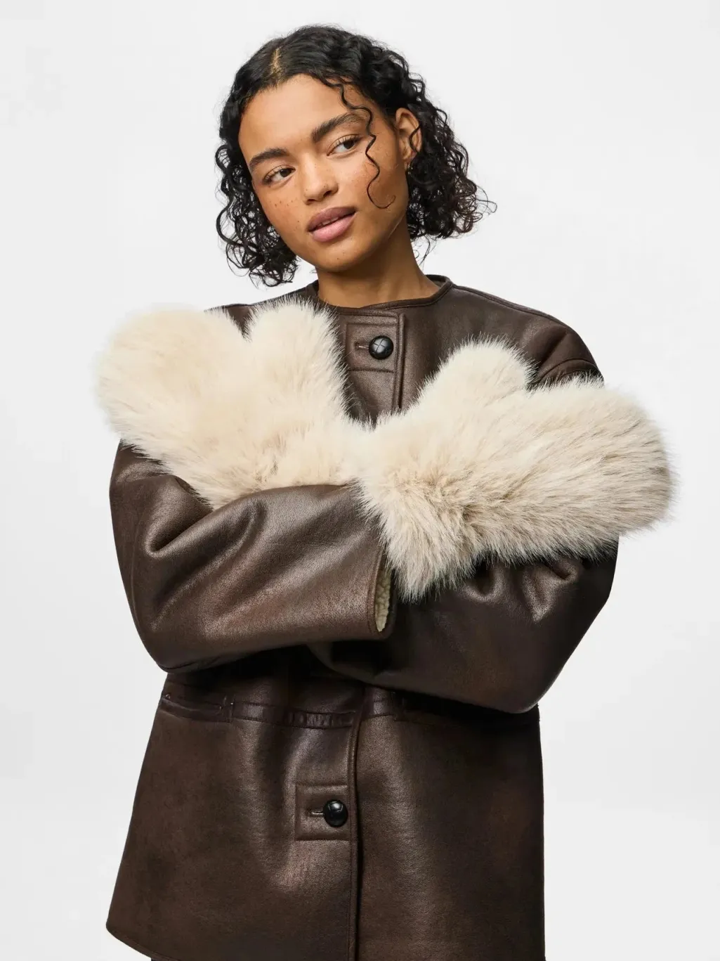 Bløde vanter fra Pieces i en beige-grå nuance med et let patchwork-udtryk. Vanterne har en fluffy overflade.