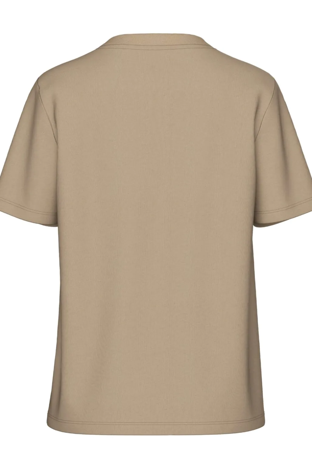 T-shirt fra Pieces i beige Silver Mink-nuance. Den er fremstillet af økologisk bomuld med en rund halsudskæring og korte ærmer.