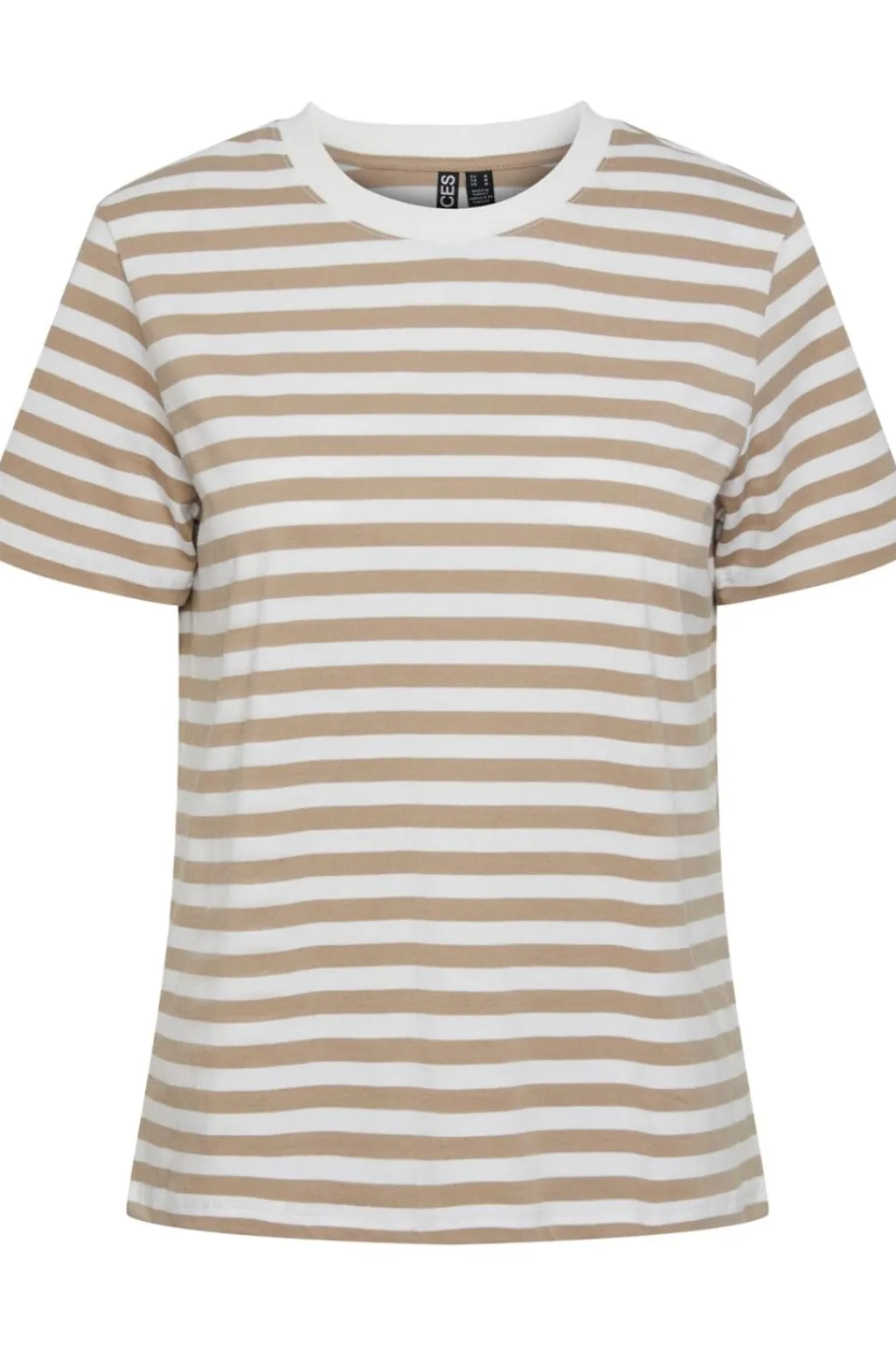 Stribet t-shirt fra Pieces i beige og hvide striber. T-shirten har en rund hals og korte ærmer. Den er lavet af økologisk bomuld med en regular fit.
