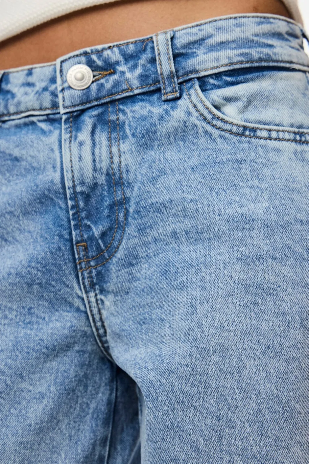 Lyseblå jeans fra Pieces med lav talje og wide leg-pasform. Bukserne har et videre snit i benene og er mere tætsiddende omkring hoften, hvilket giver en afslappet silhuet.
