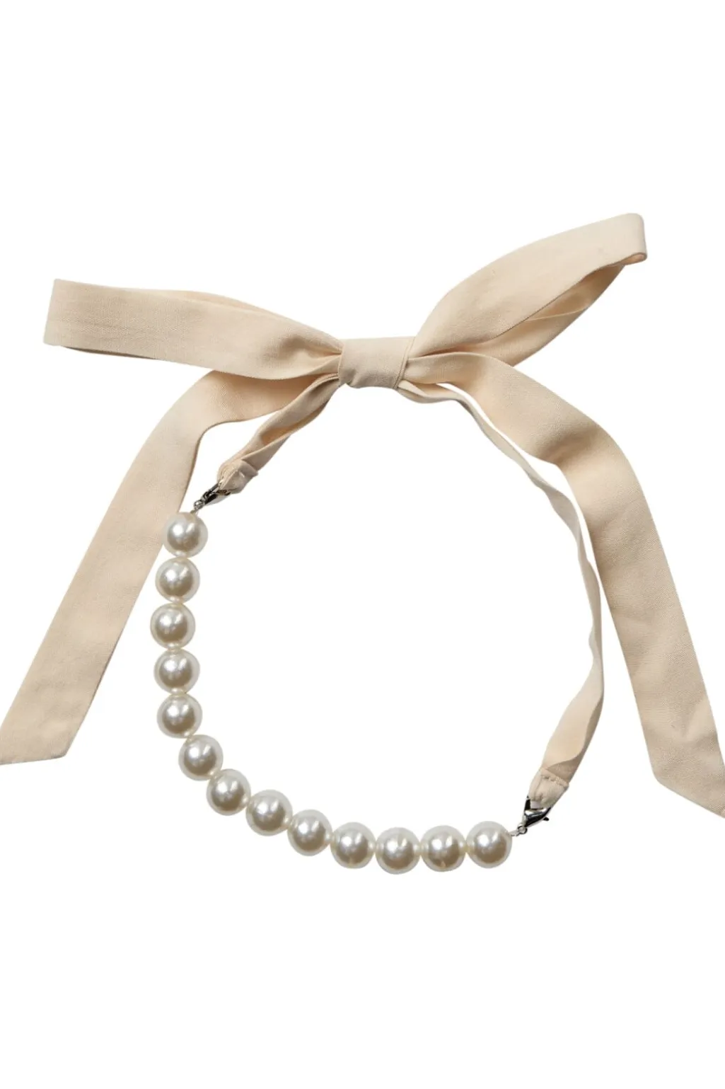 Choker-halskæde fra Co´Couture med perler og stofbånd i bone-farve. Halskæden har en række skinnende perler og afsluttes med en sløjfe i samme farve som båndet.
