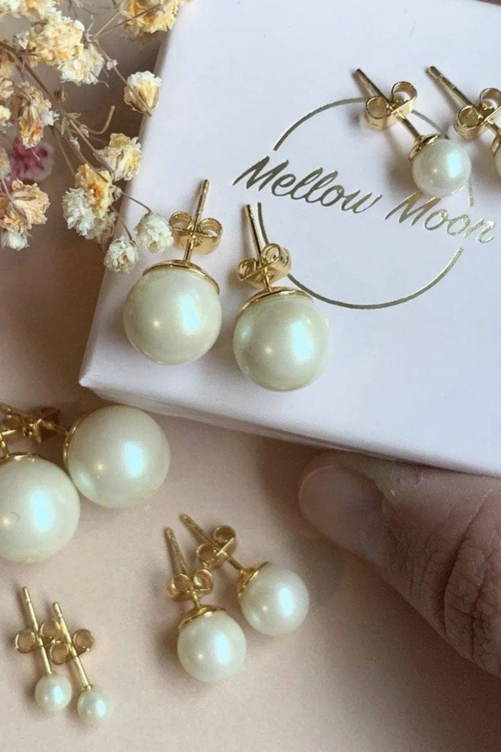 Perleøreringe fra Mellow Moon med forgyldt finish og cremehvide glasperler. Øreringene fås i forskellige perlestørrelser fra 4 til 12 millimeter, så de kan tilpasses den enkeltes stil.