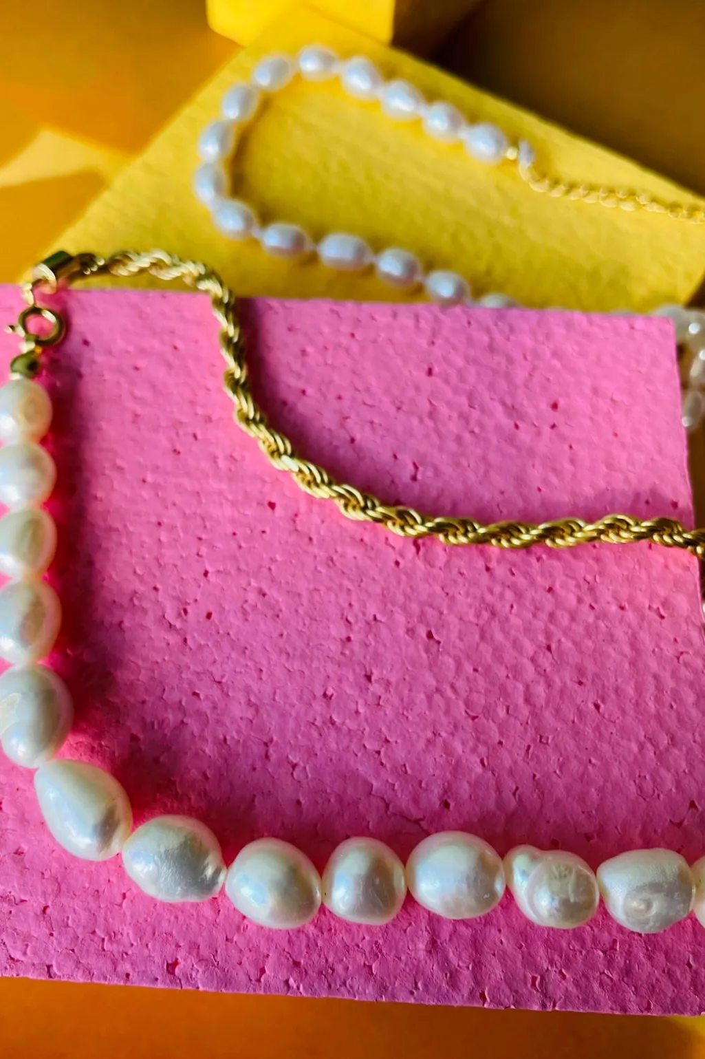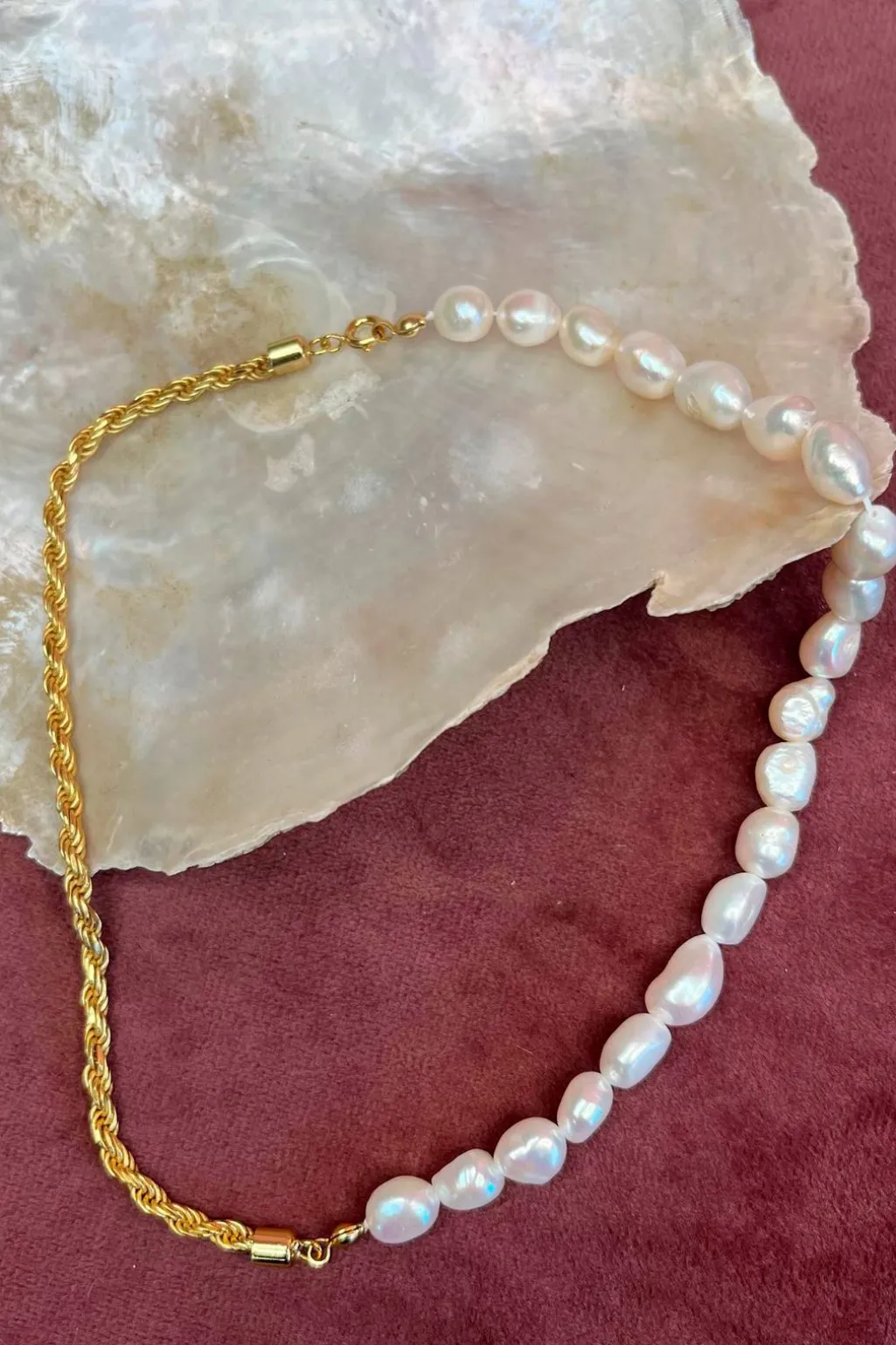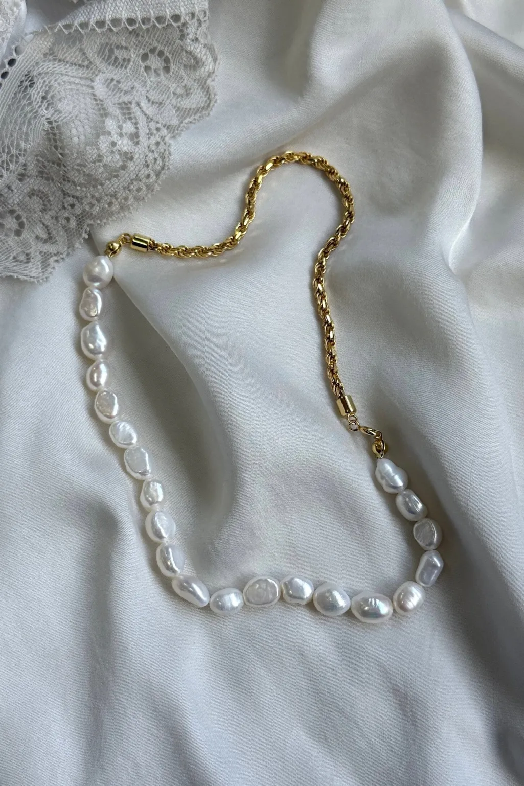 Halskæde fra Mellow Moon med naturperler og forgyldt sterling sølv. Det har perler på den ene halvdel og guldkæde på den anden, og er helt nikkel- og blyfrit.