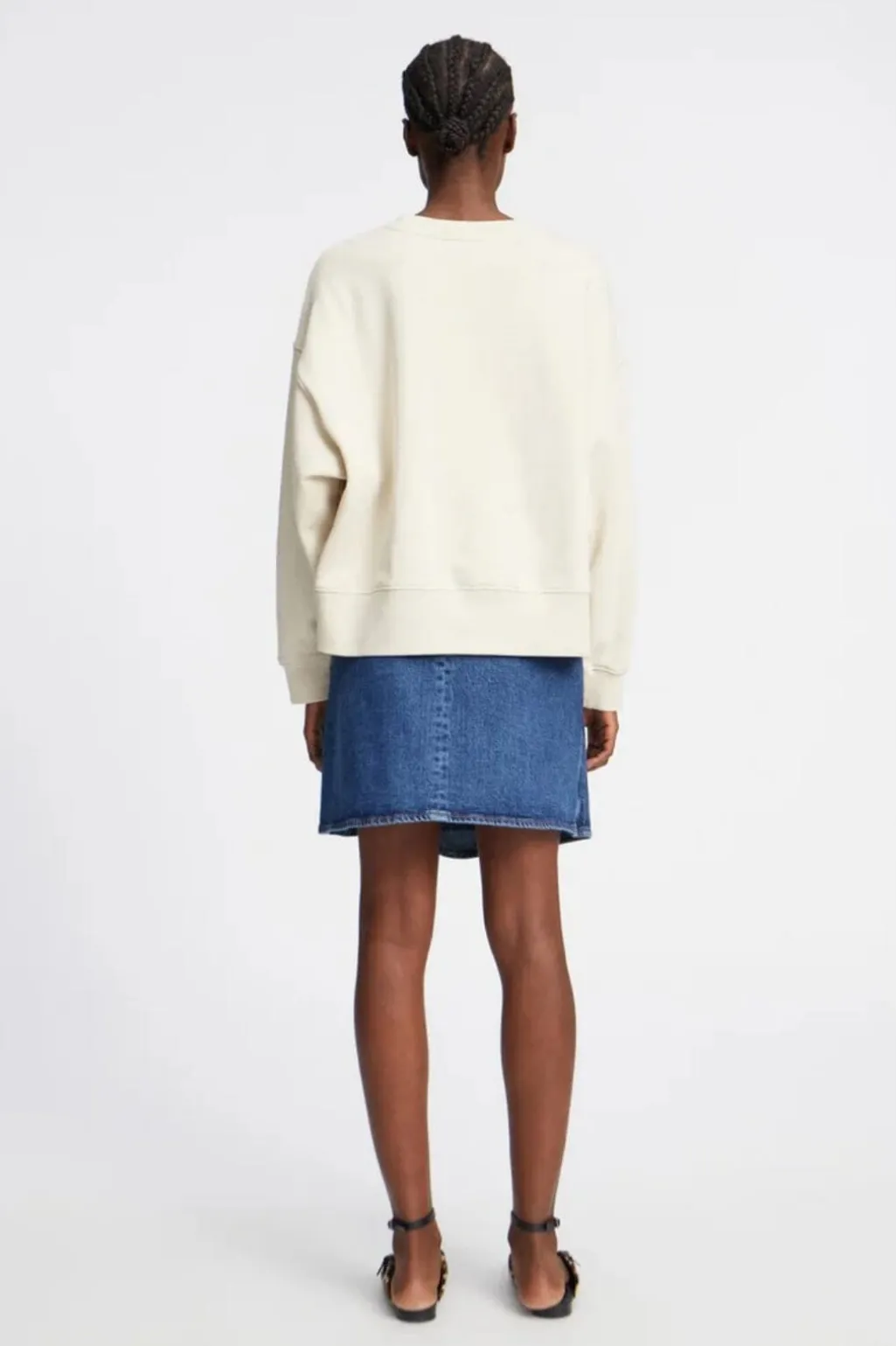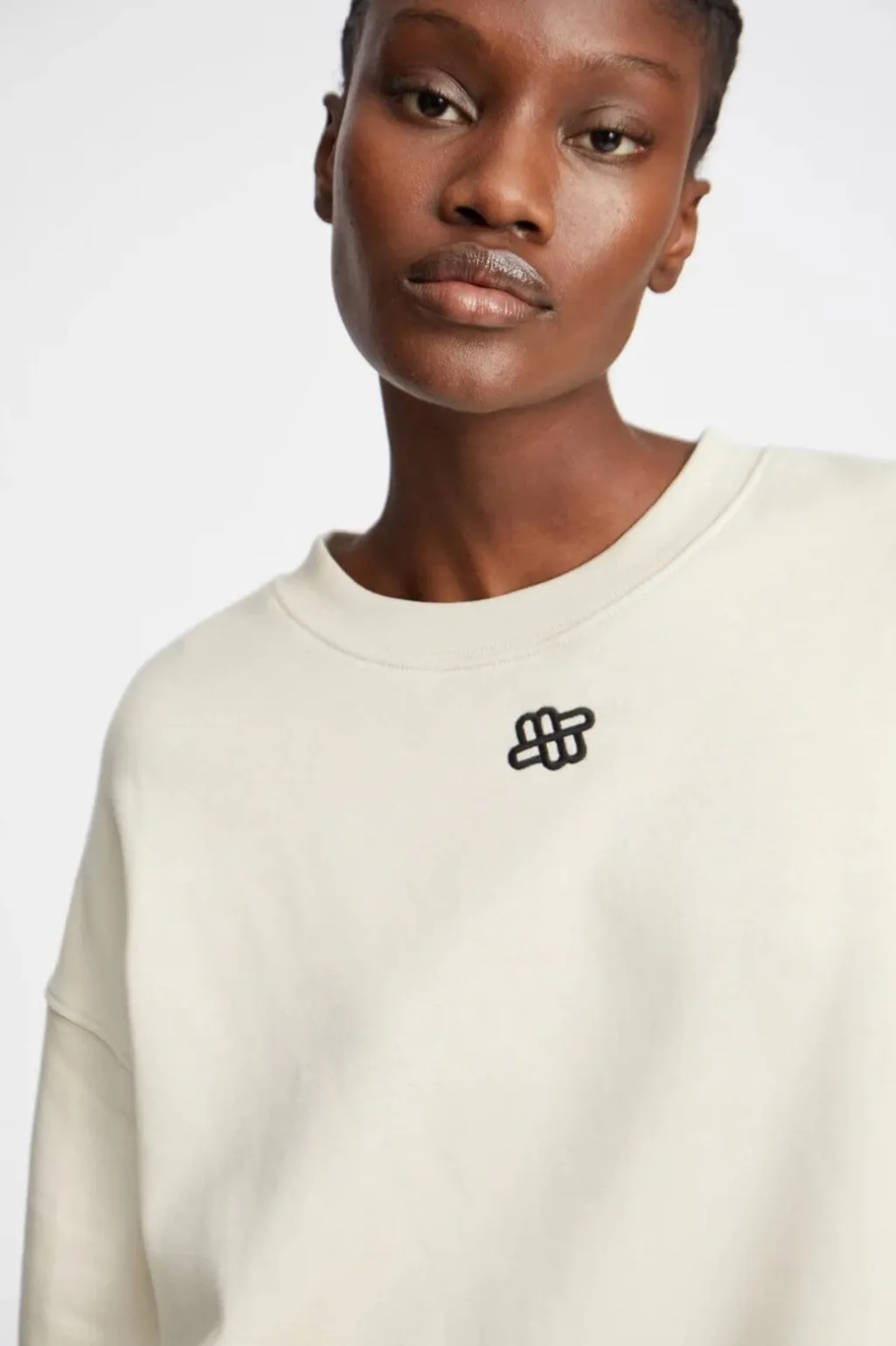 Cremefarvet sweatshirt fra Munthe med rund halsudskæring og et lille sort broderet logo på brystet. Sweatshirten har en løs pasform med faldende skuldre og er fremstillet i blødt materiale.