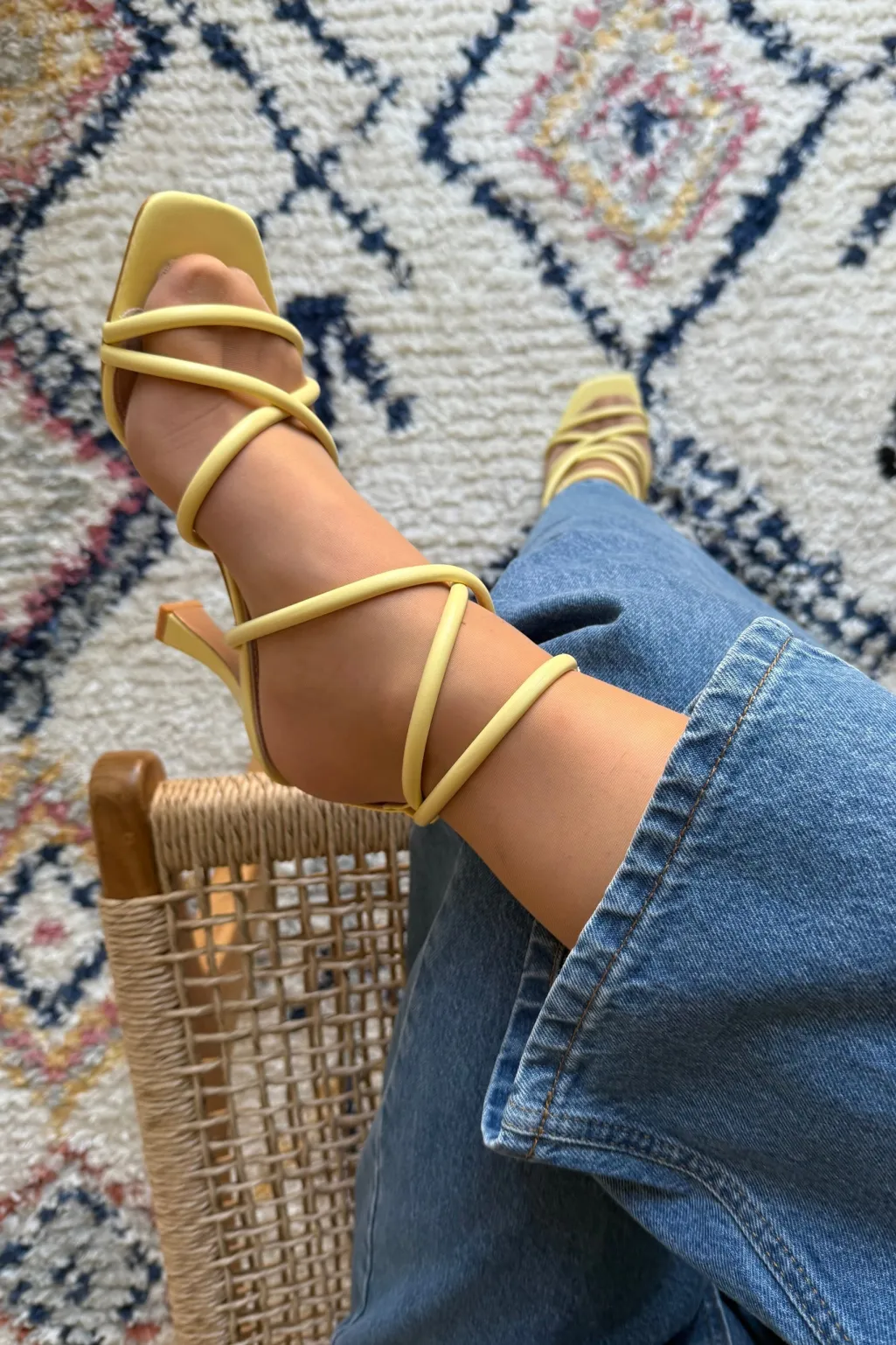 Gule stiletter fra Bloom med krydsende remme omkring anklen. Skoene har en firkantet tå og fine stropper, der giver støtte og et moderne design.