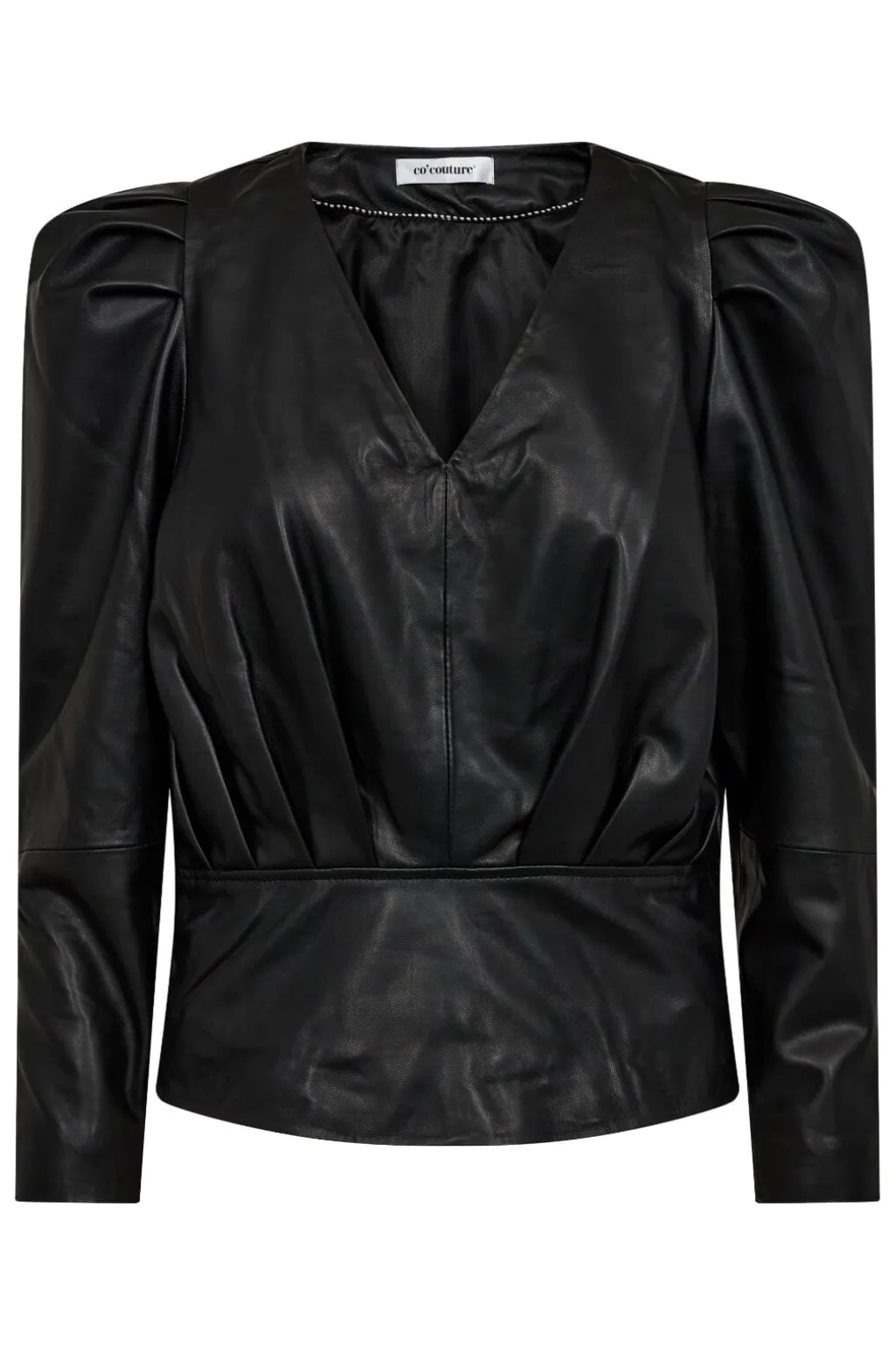 Sort læderbluse fra Co’couture med drapering og puffede ærmer. Blusen har en dyb V-udskæring og draperede detaljer, der skaber bevægelse i stoffet.