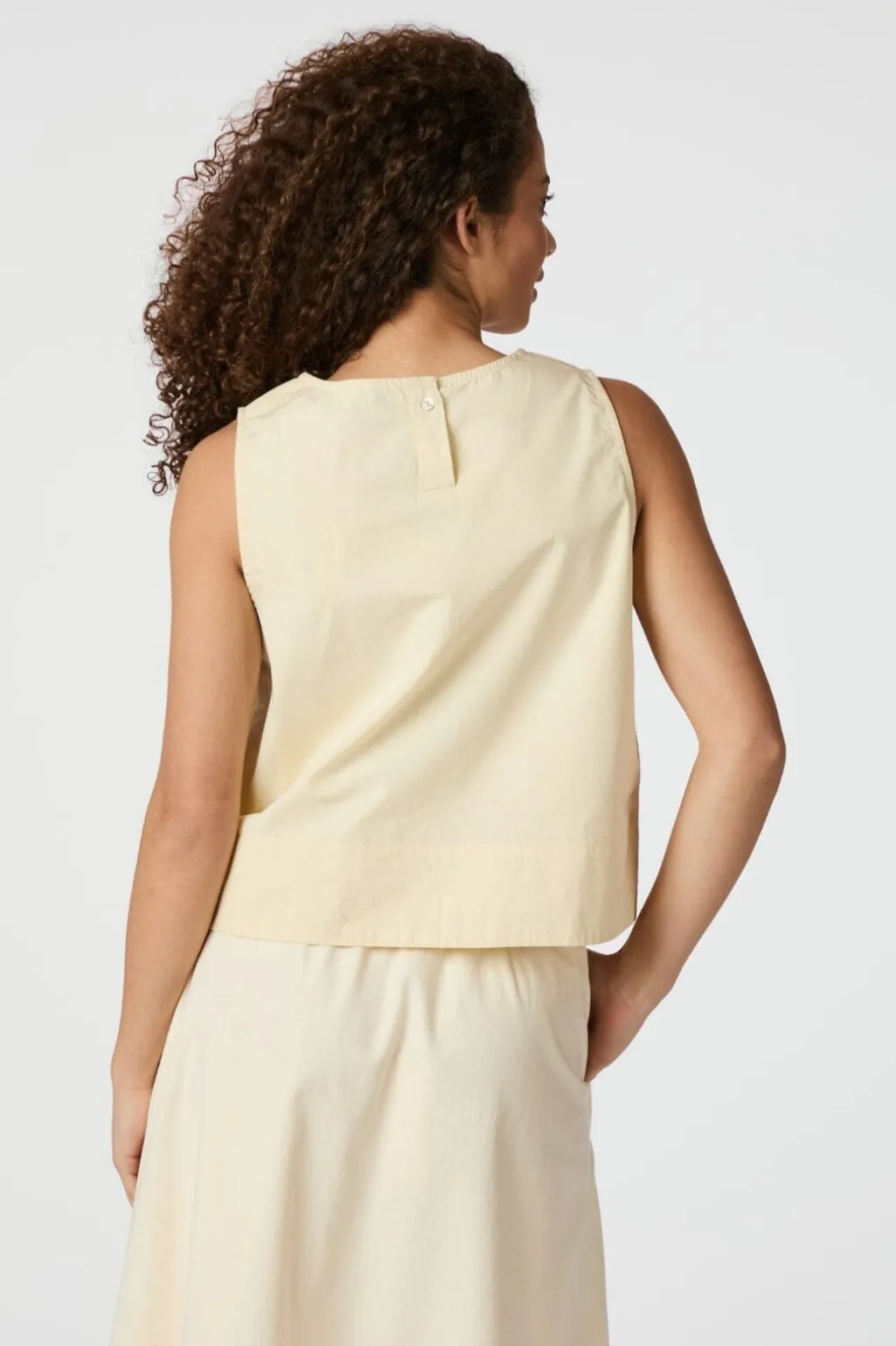 Lys gul top fra Neo Noir i poplin-kvalitet. Toppen har en løs pasform med v-halsudskæring, bindebånd og flæsedetaljer. Den ærmeløse stil giver et sommerligt udtryk.