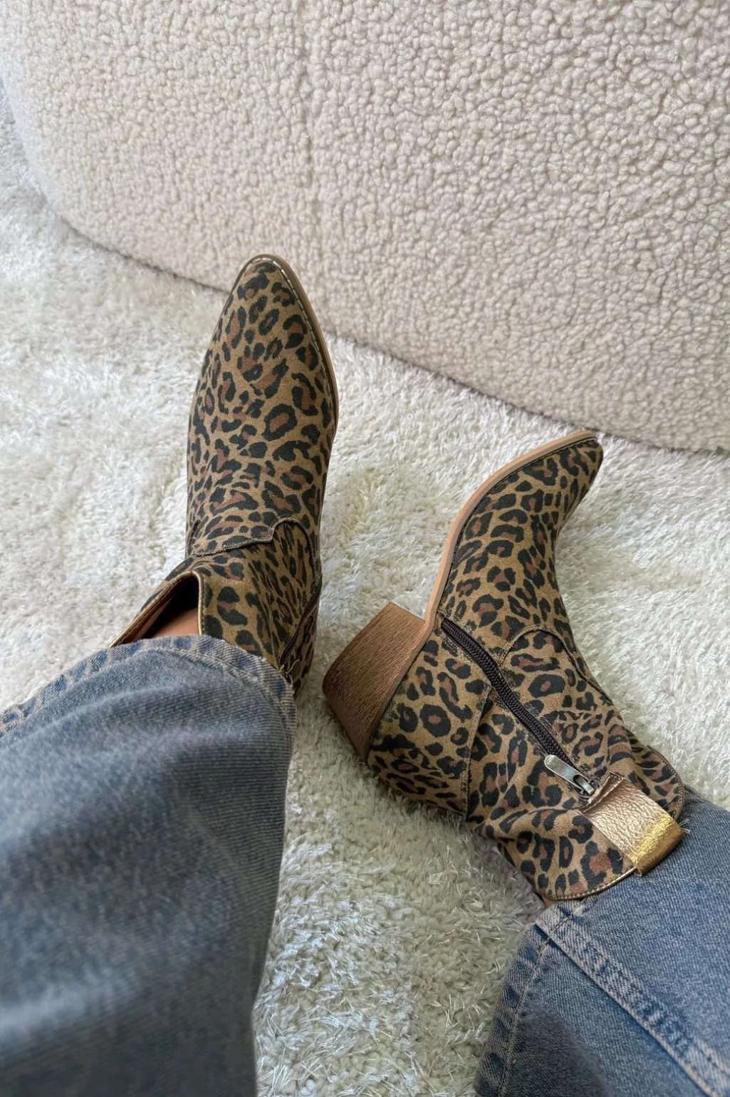 Ankelstøvler fra Bloom med leopardmønster i brune og beige nuancer. Støvlen har en spids tå og en 8-10 cm blokhæl, der giver god støtte til foden.