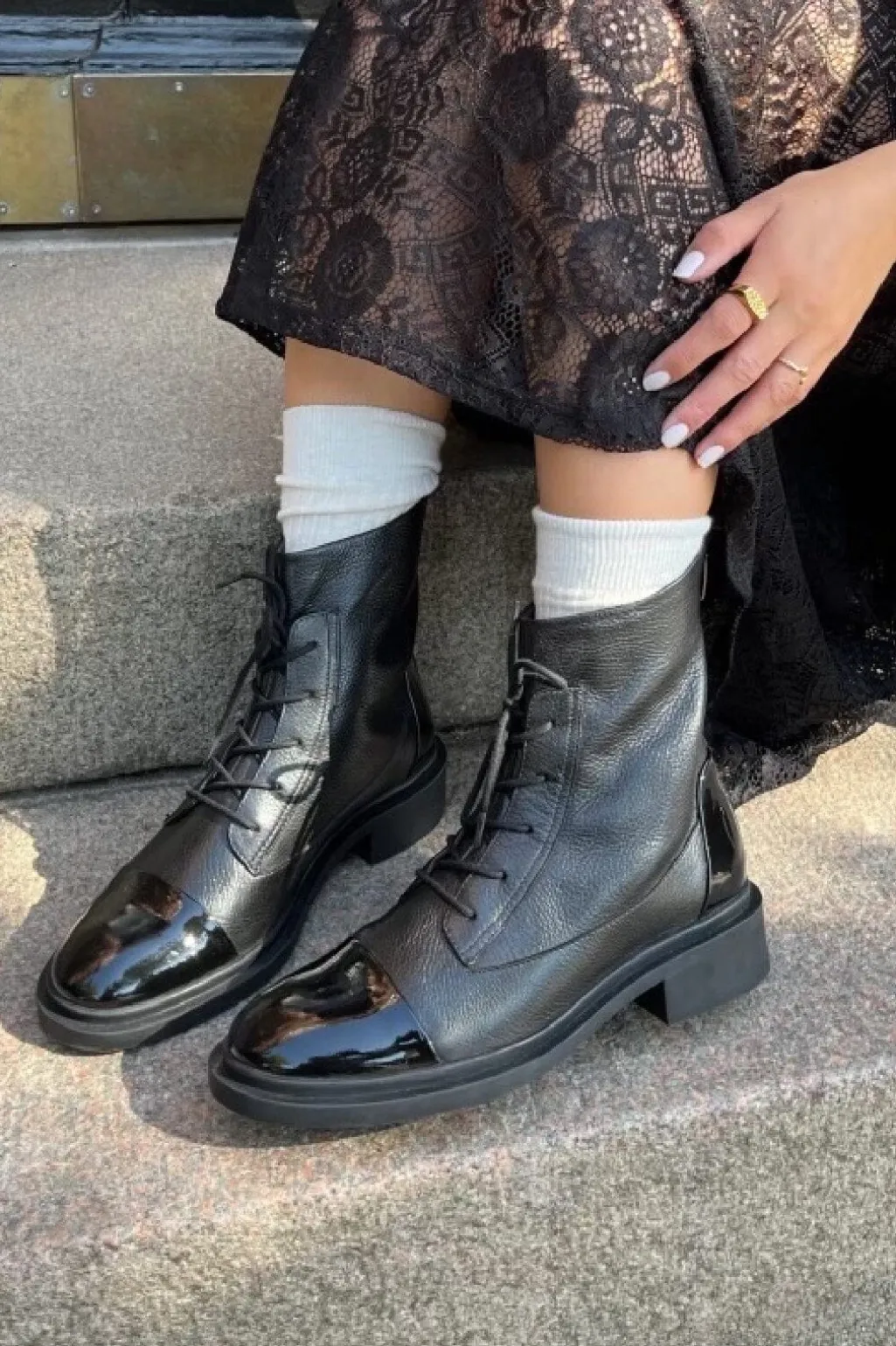 Sorte ankelstøvler fra Copenhagen Shoes med blank patenttå. Støvlerne har både snørebånd og lynlås samt en lav blokhæl.