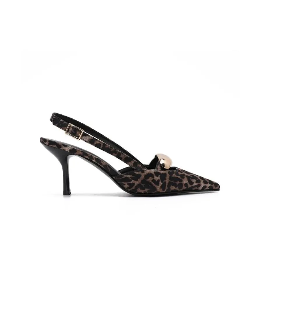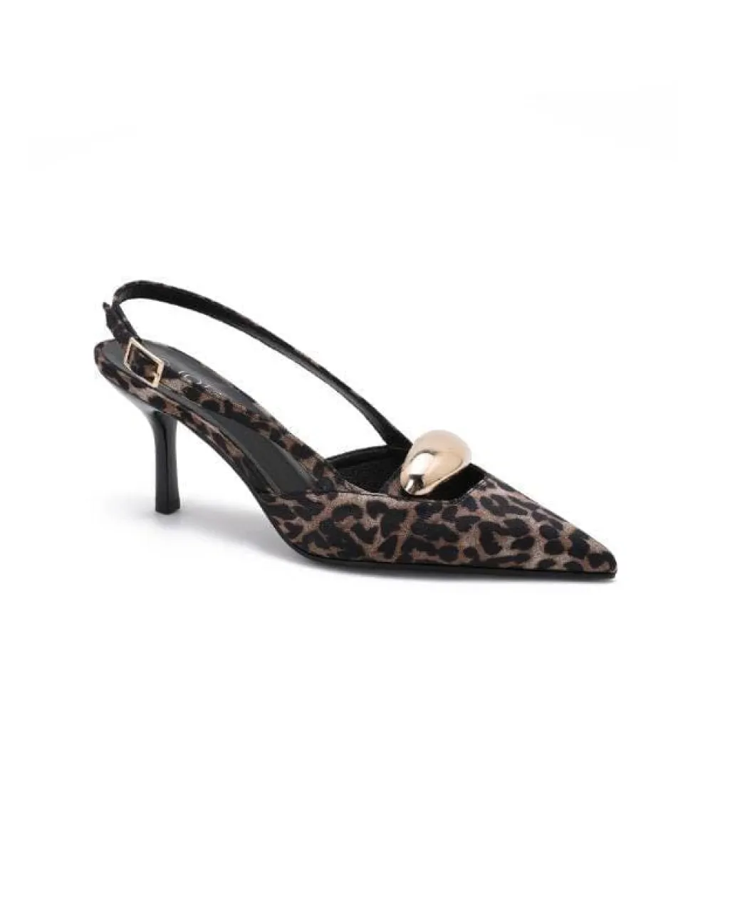 Stiletter fra Bloom i leopardmønster med brune og beige nuancer. Skoene har en spids tå, stilettohæl og en slingback-rem med spænde.