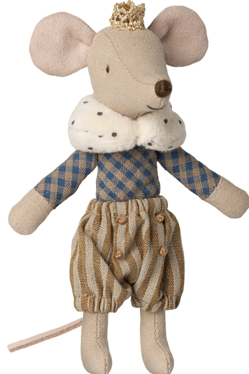 En legetøjsmus fra Maileg med en guldfarvet krone, en blå og beige ternet skjorte og stribede bukser med en dekorativ krave.