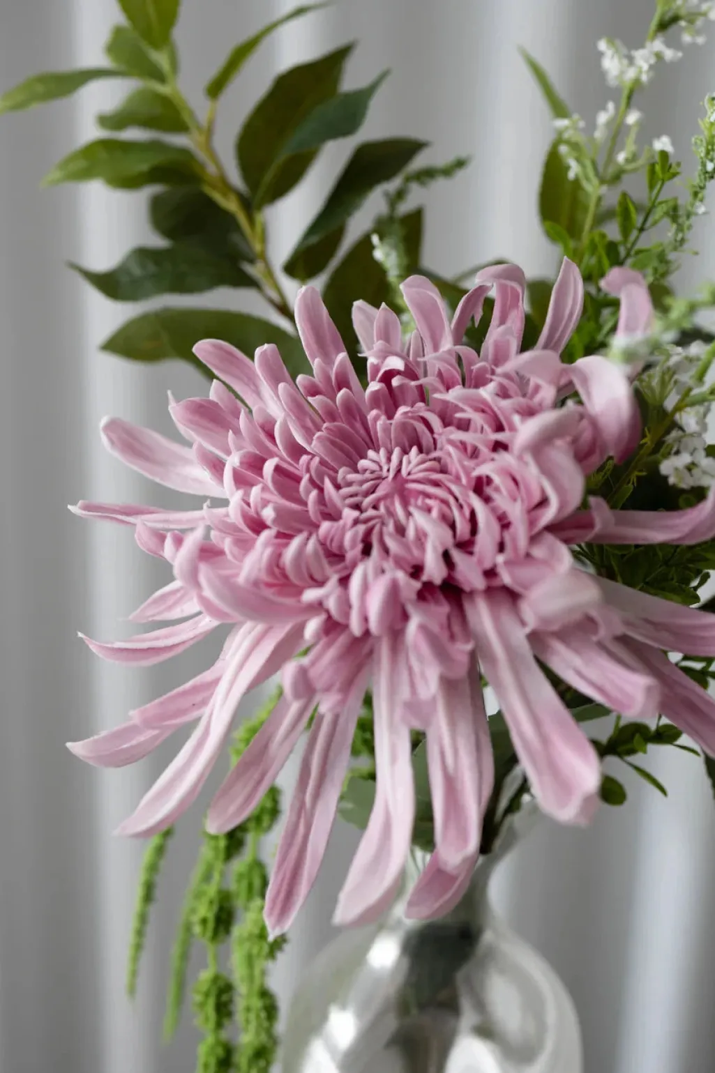 Introduktion af vores Purple Blossom Bouquet – en livlig blomsteropsats omhyggeligt fremstillet med latex for et autentisk og naturtro udseende. Buketten indeholder en fantastisk samling af blomster.Denne buket indeholder:**Plante – Hvid:** Den grønne plante stråler med sine friske grønne blade og elegante hvide blomster, hvilket tilføjer et rent og harmonisk touch.**Amaranthus 6 forgreninger:** Den grønne amaranthus stråler med sine unikke, hængende blomsterklaser og friske grønne nuancer, hvilket tilføjer en moderne og livlig elegance.**Grønne Blade:** Det frodige grønne monstera-blad fascinerer med sit dristige, splittede design og rige smaragdgrønne nuance, hvilket bringer et livligt og forfriskende strejf af naturens elegance til enhver opsats.**Krysantemum – Lilla:** Krysantemumen imponerer med sine lagdelte, indviklede kronblade og livlige farver, der symboliserer lang levetid og glæde, samtidig med at den tilføjer et strejf af klassisk charme.