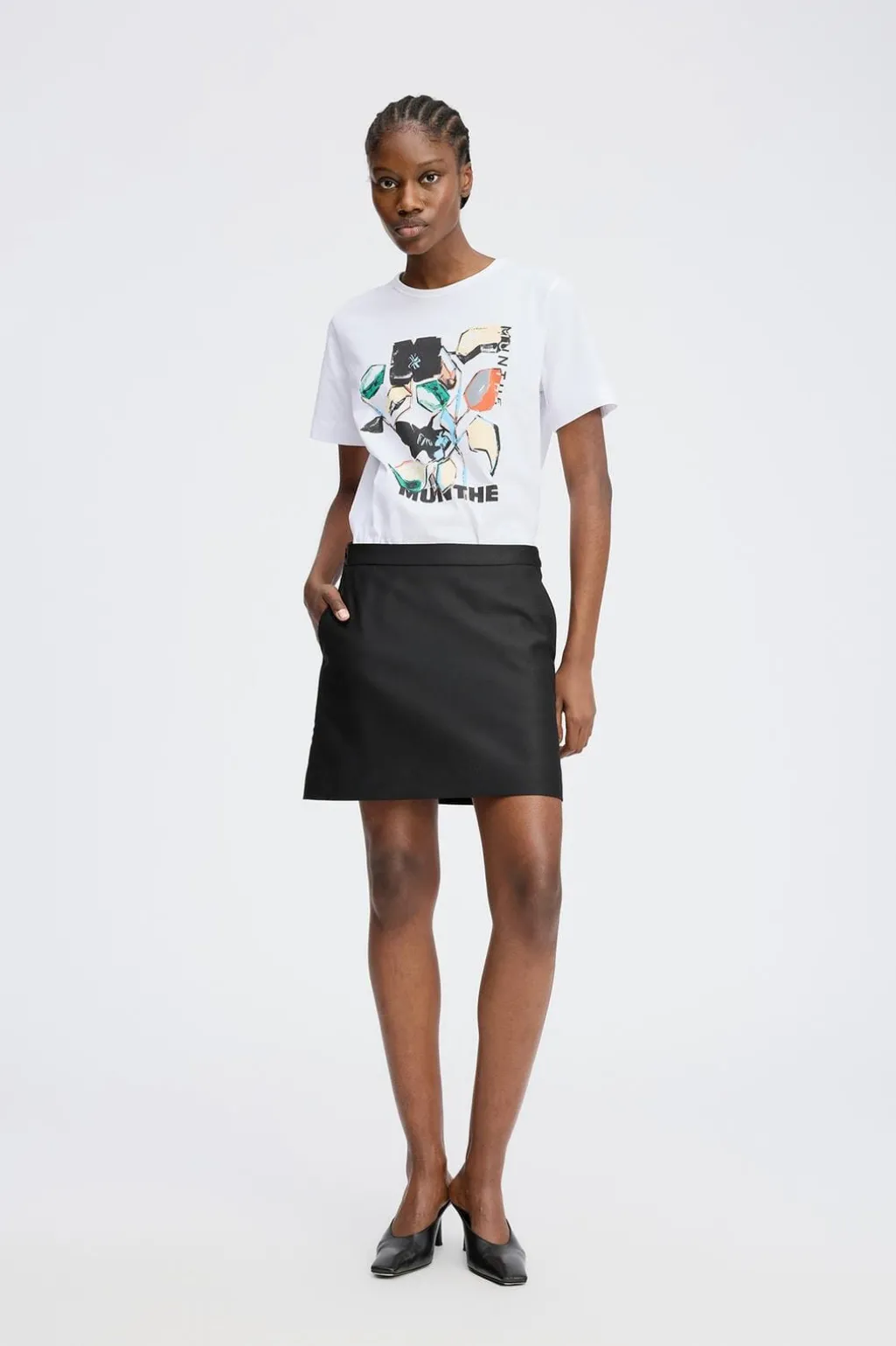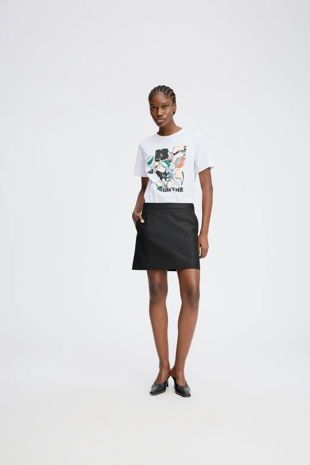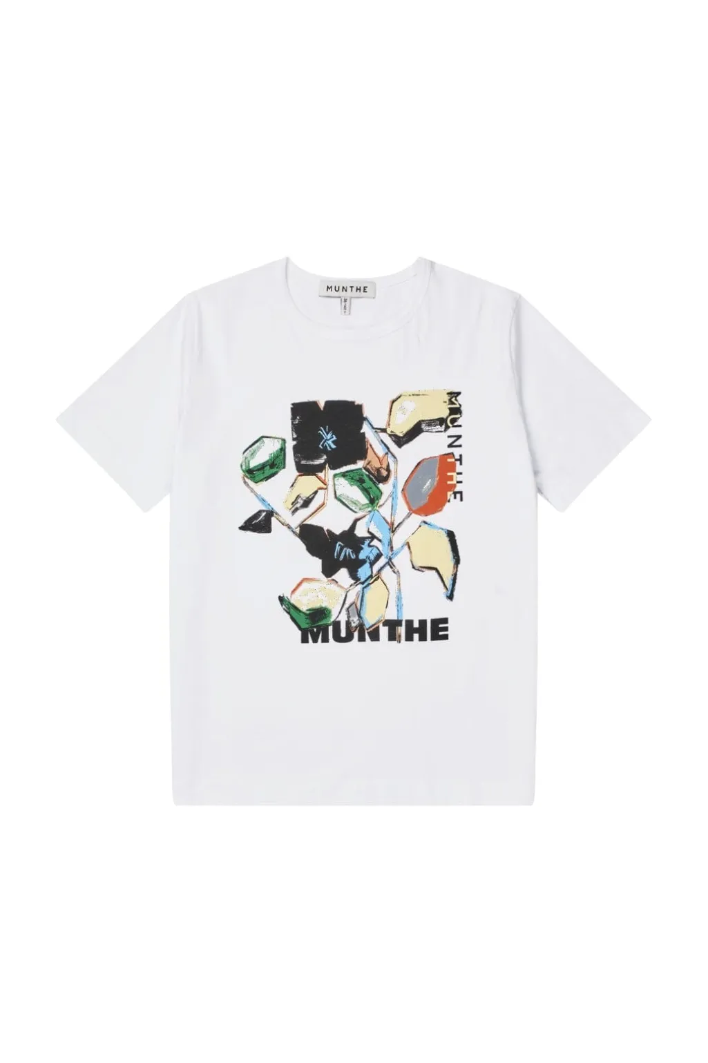 Hvid t-shirt fra Munthe med kunstnerisk print i flere farver. T-shirten har en rund halsudskæring og korte ærmer med et diskret logo på ærmet.