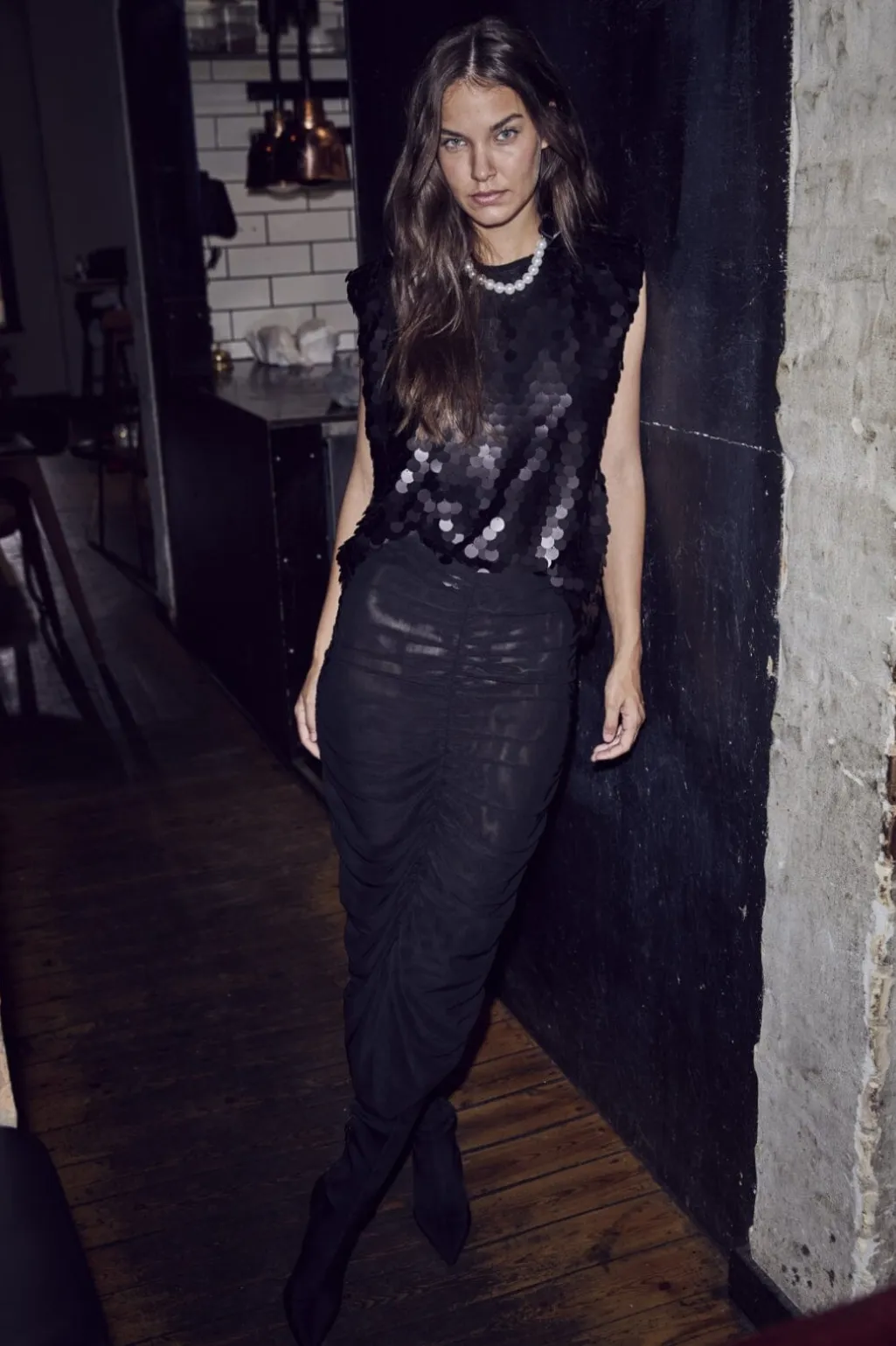 Sort knælang nederdel fra Co´couture med rynkeeffekt langs siderne. Den elastiske talje og det rynkede design gør nederdelen velegnet til festlige anledninger.