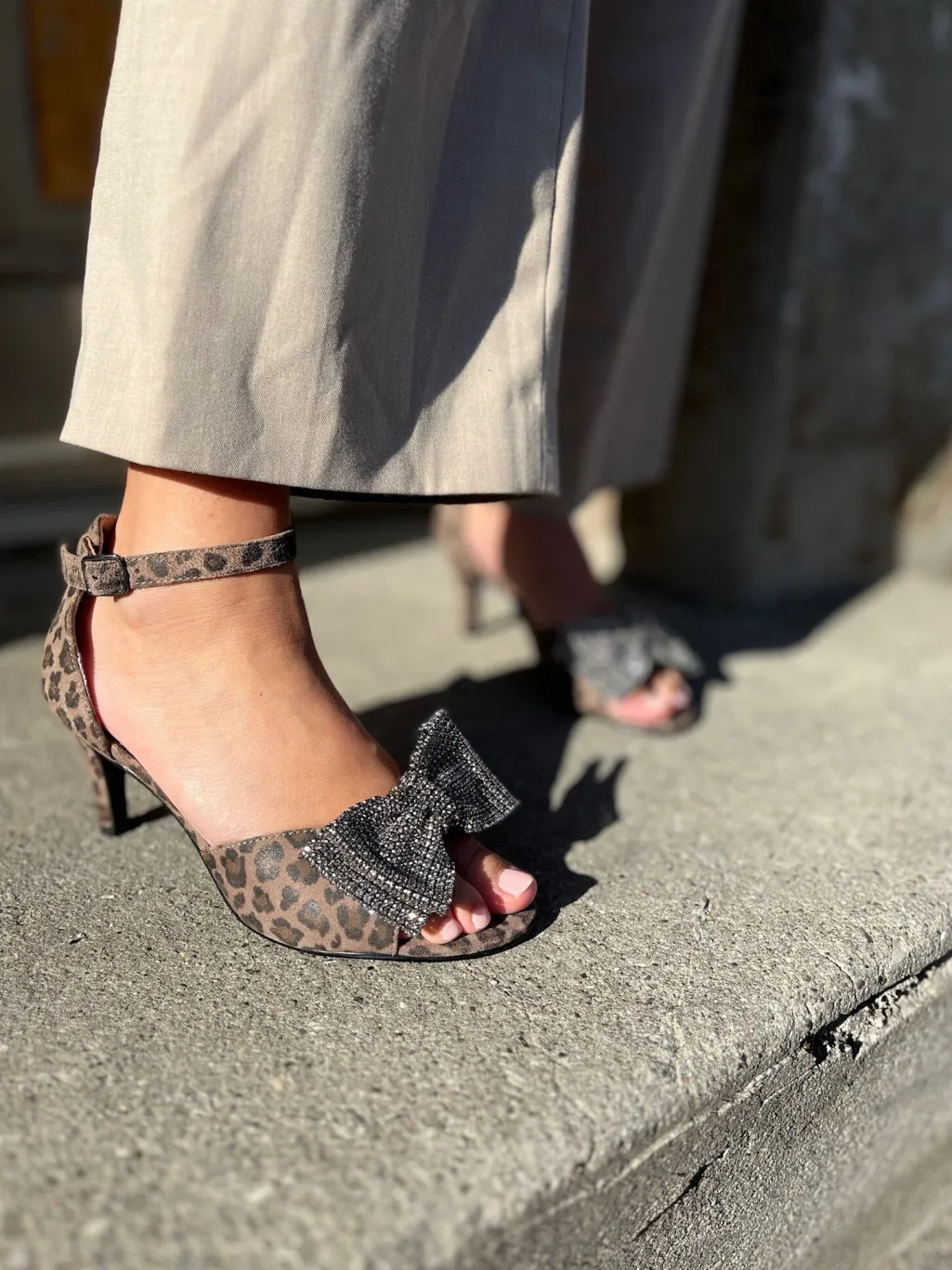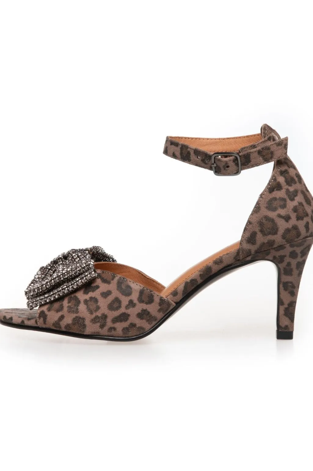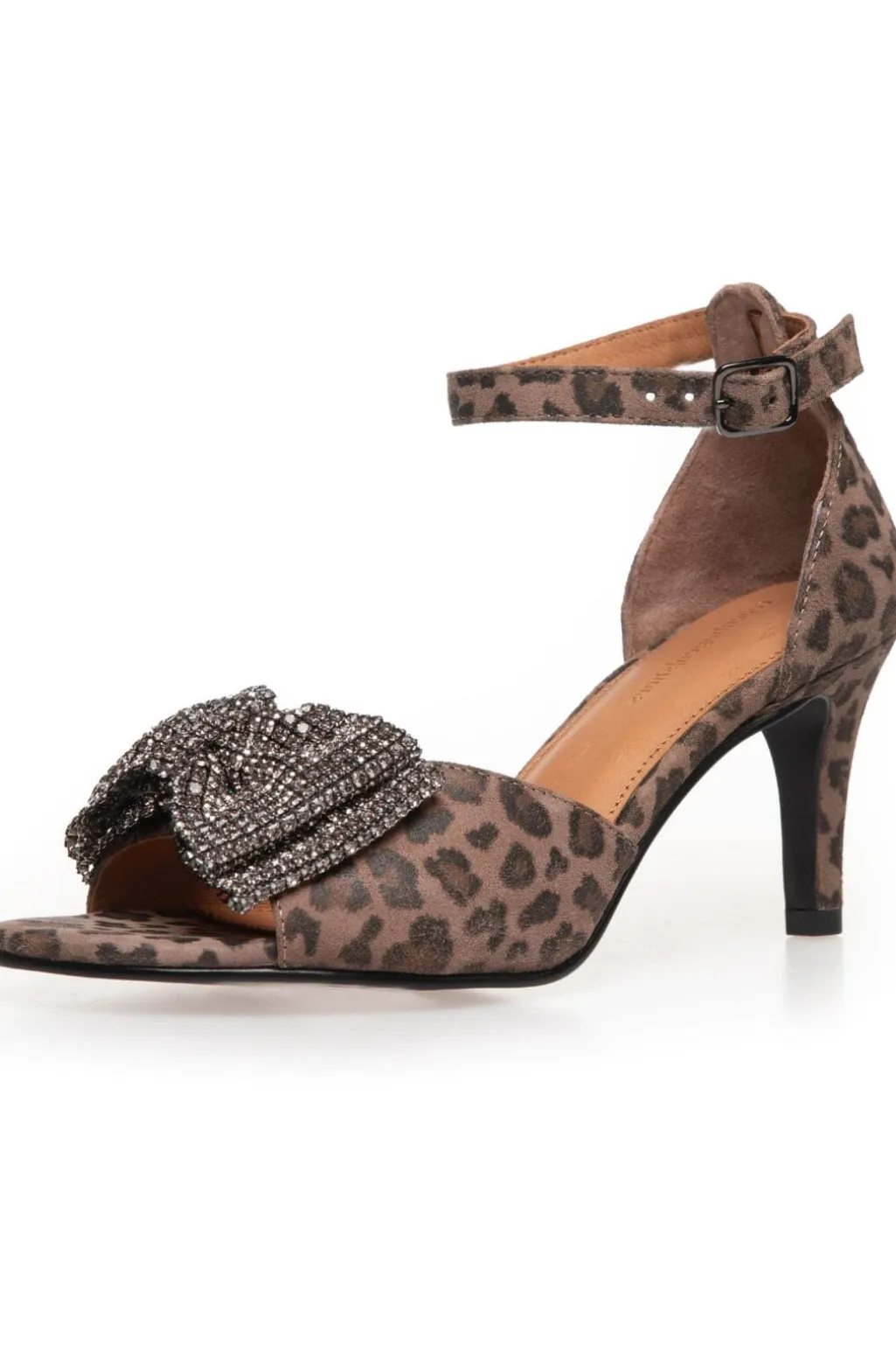 Festsandal fra Copenhagen Shoes i ruskind med leopardmønster. Skoene har en dekorativ sløjfe med rhinsten på forsiden og en ankelrem med spænde.