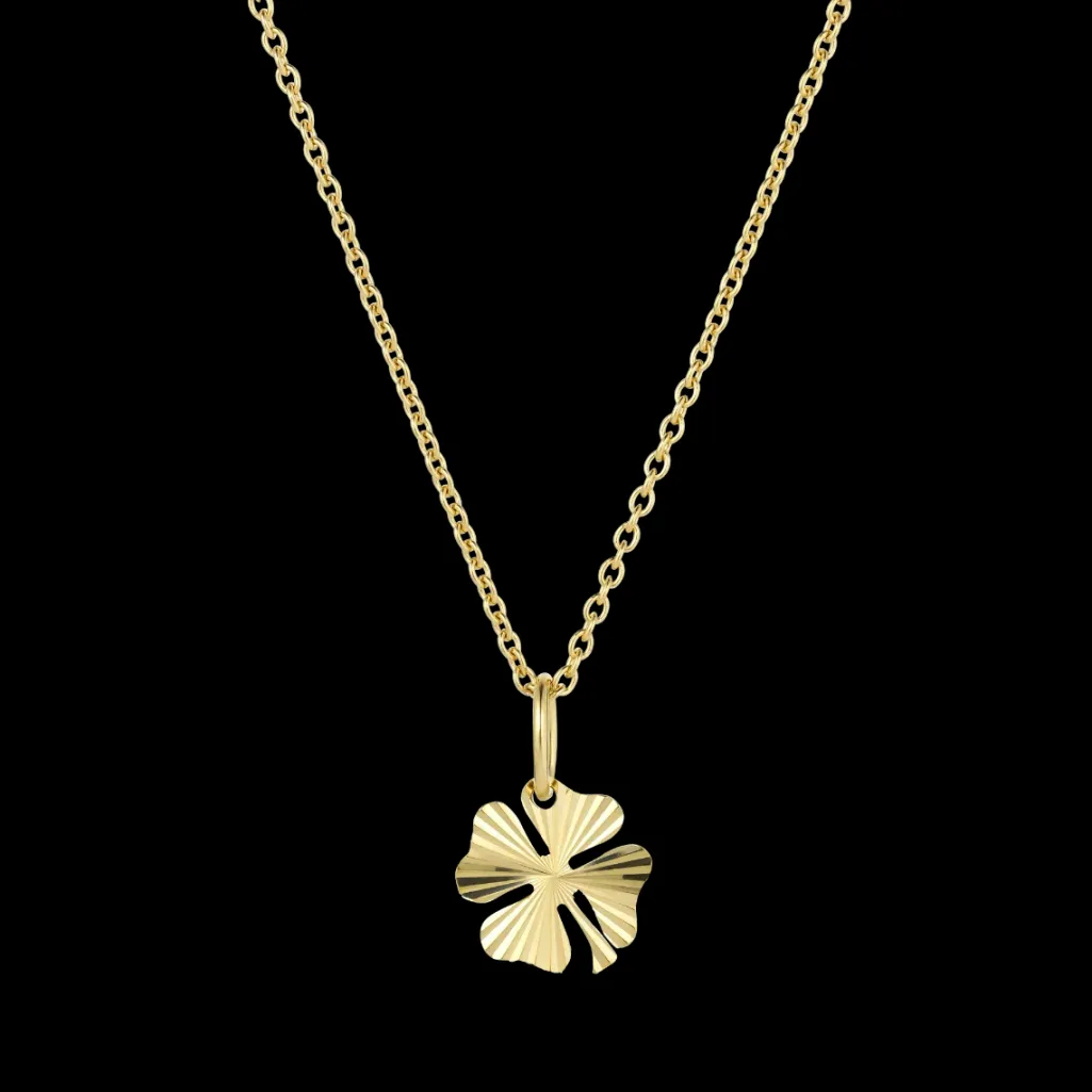 Forgyldt kløvervedhæng fra Jane Kønig med ribbet overflade. Vedhænget er fremstillet i sterling sølv med 18 karat guldbelægning og har en højde på 10 millimeter.