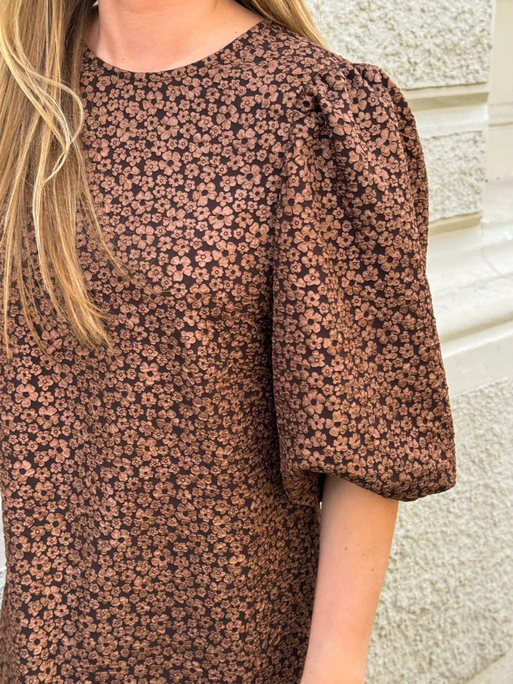 Lang kjole fra Noella i brun med små blomster. Kjolen har korte pufærmer, rund hals og en løs pasform. Bindebåndet på ryggen og slidsen i begge sider giver bevægelsesfrihed.