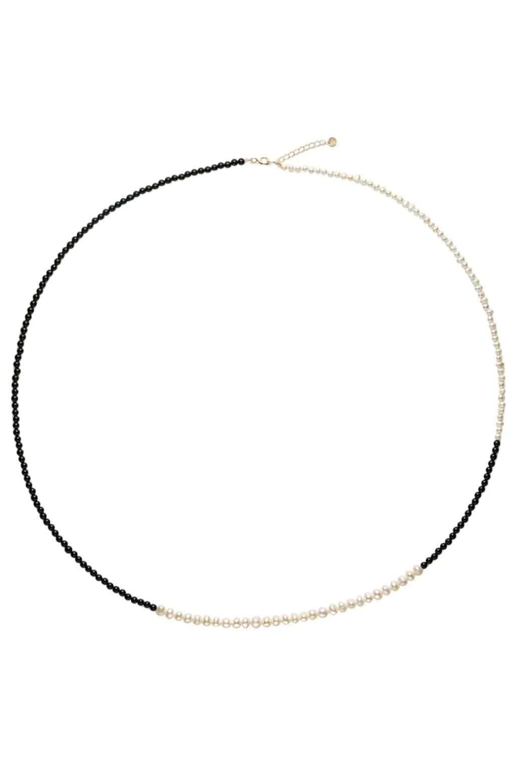 Håndlavet halskæde fra Sorelle Jewellery med sort agat og hvide ferskvandsperler. Designet veksler mellem sorte og hvide perler og har en forgyldt lås med forlængerkæde.
