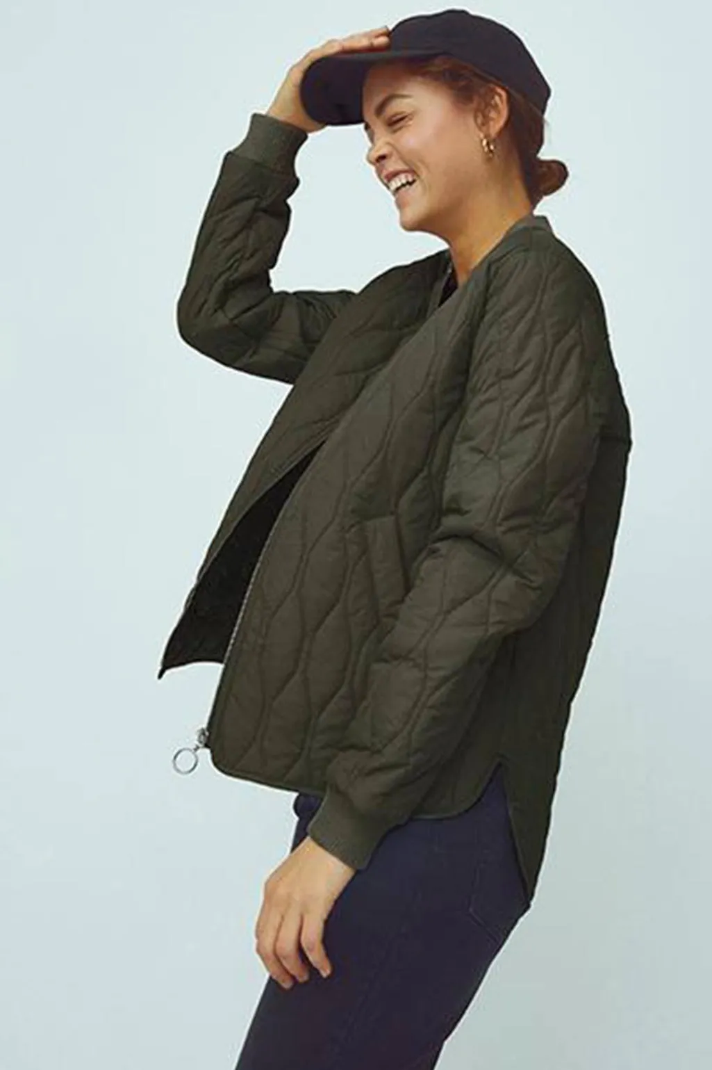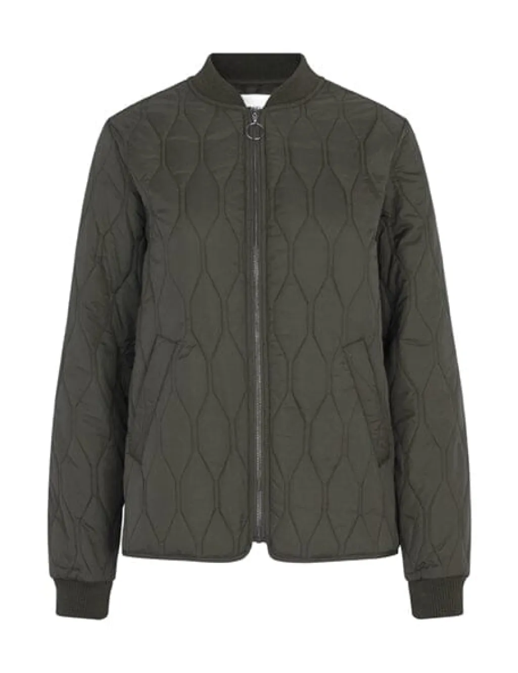 Kort termojakke i mørkegrøn fra Global Funk med quiltet tekstur. Jakken har en rund hals, lynlåslukning foran og ribkanter ved håndleddene.