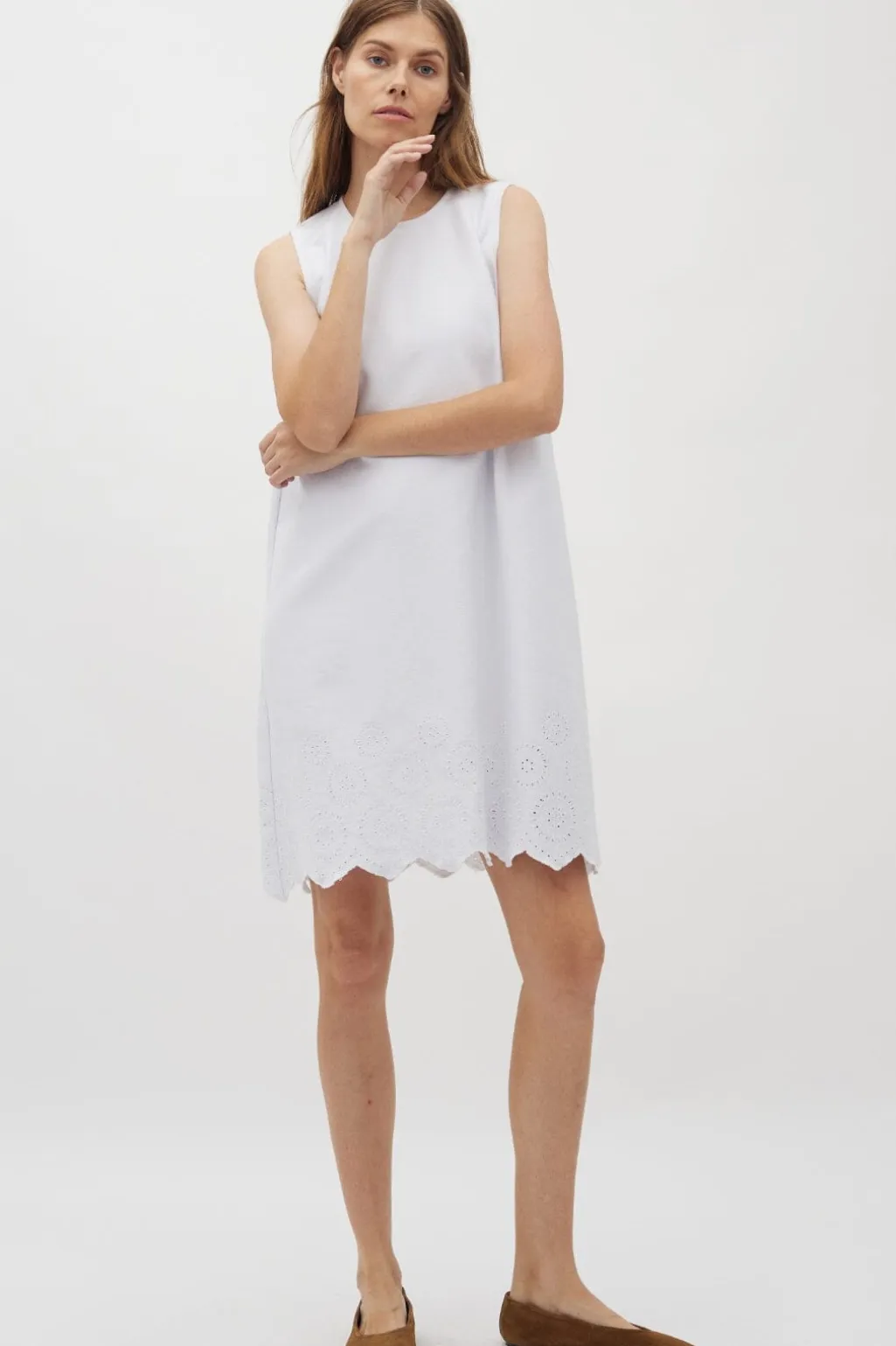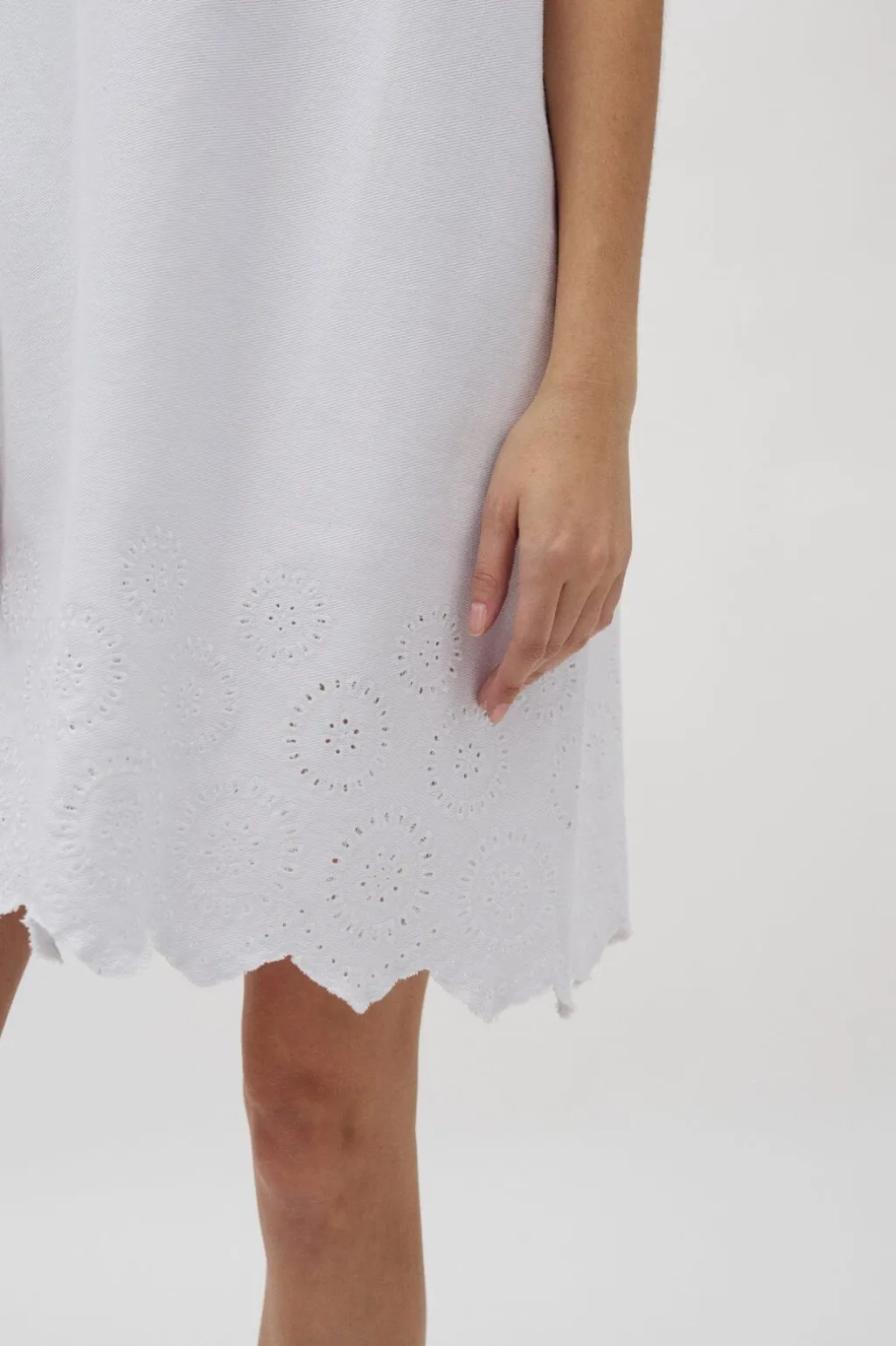 Hvid sommerkjole fra Global Funk i 100 % bomuld. Kjolen har en rund hals og et ærmeløst design med broderede øjne og scallopkant forneden.