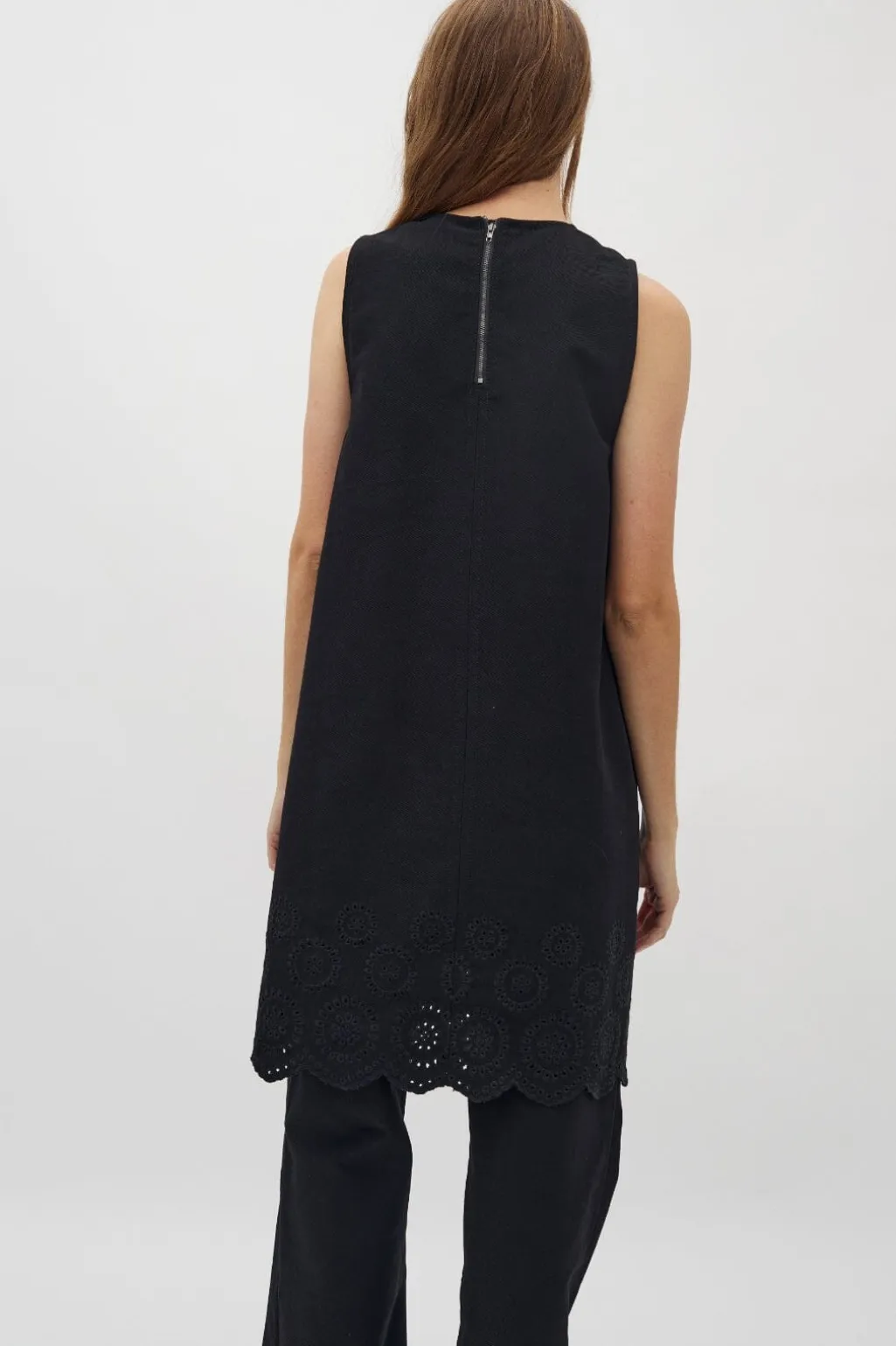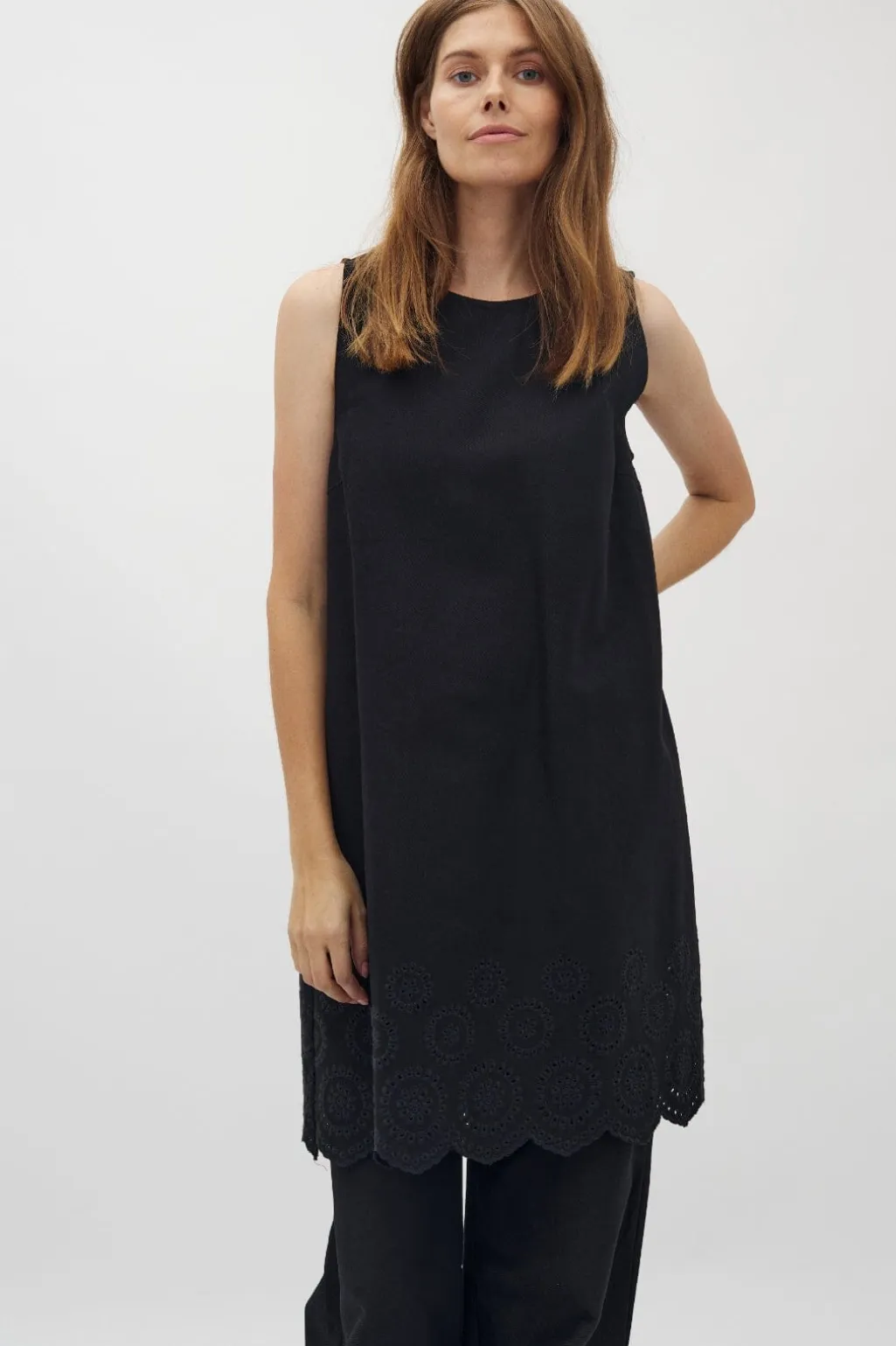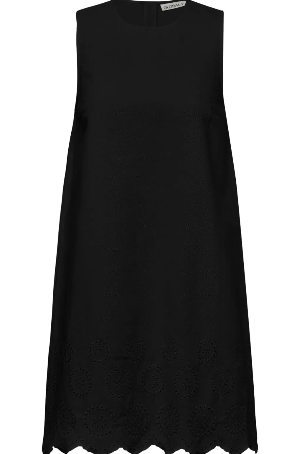 Sort kjole fra Global Funk med broderede scallop-detaljer langs kanten. Den har en rund hals og et ærmeløst design, der gør den nem at style med forskellige overdele.