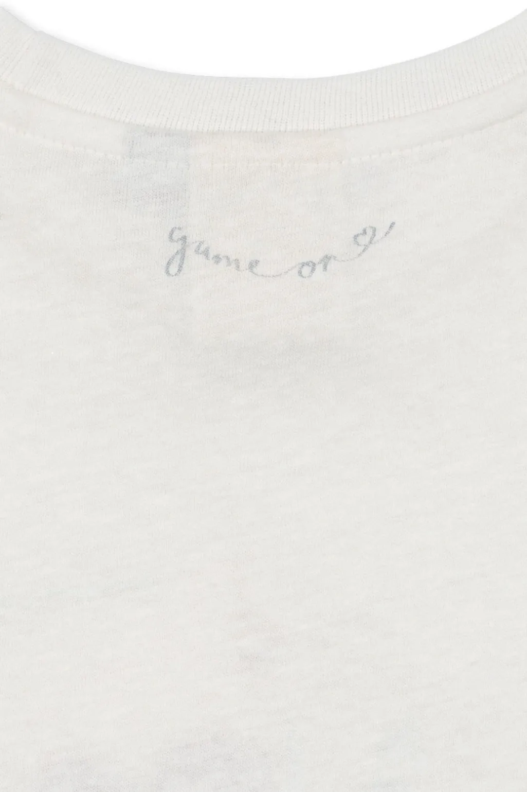 Det grafiske print viser et klassisk spillekortdesign med Jack of Hearts i rød på forsiden. Bagsiden har en håndskrevet tekst med Game On.