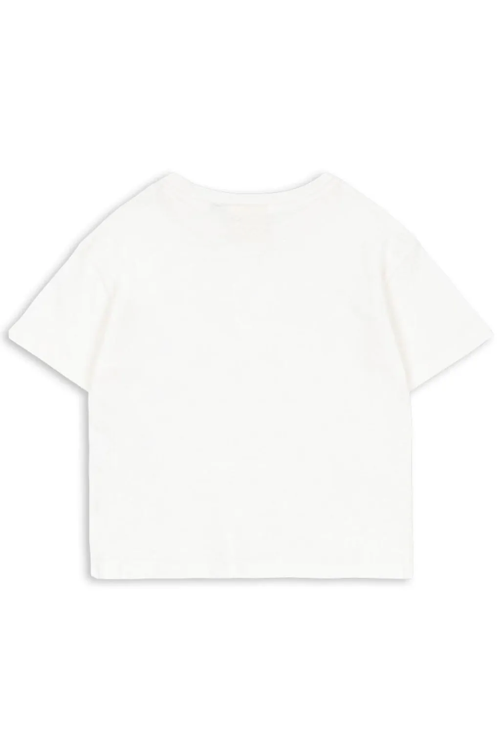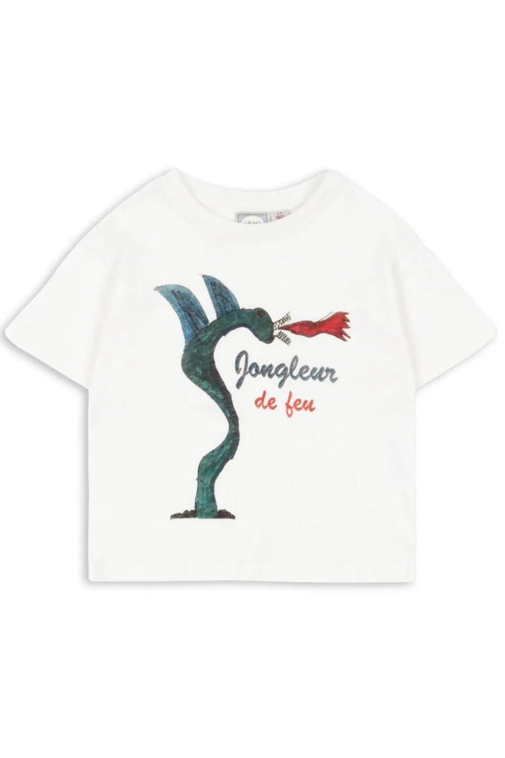 En hvid t-shirt fra Konges Sløjd med et print af en jonglerende drage. T-shirten har en rund hals og korte ærmer samt teksten Jongleur de feu i en kunstnerisk stil.