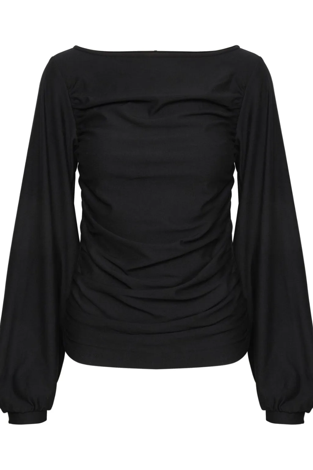 Sort bluse med ballonærmer og firkantet halsudskæring. Blusen har rynkeeffekt på forsiden og elastik ved ærmerne, hvilket skaber en god pasform.