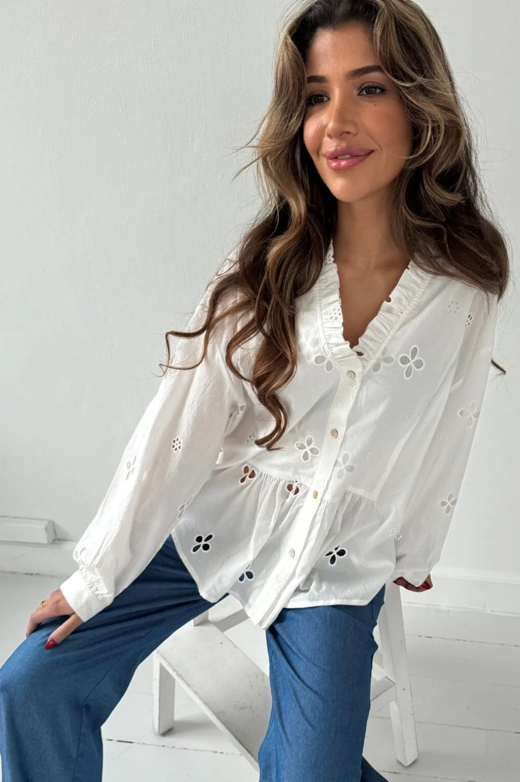 Hvid bluse fra Continue med blomsterbroderi og rynket halsudskæring. Blusen har lange ærmer og knapper foran. Designet kombinerer det feminine broderi med praktiske detaljer.