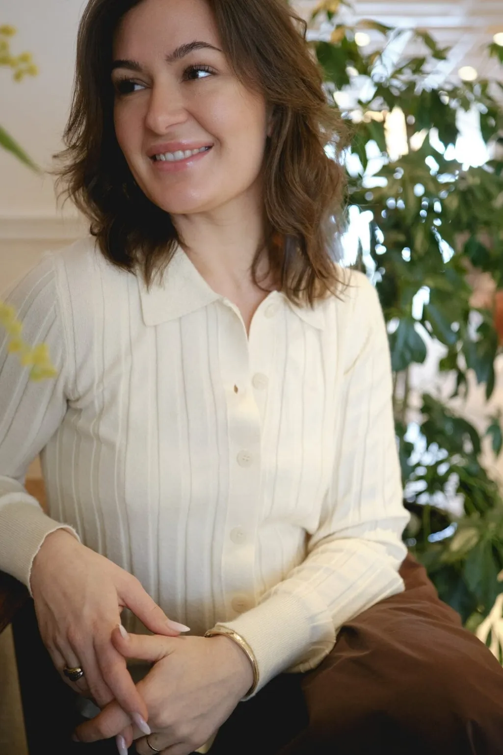 Lys gul cardigan fra Neo Noir med ribstrikket tekstur. Den har polokrave og knaplukning foran, hvilket gør den nem at style både åben og lukket.