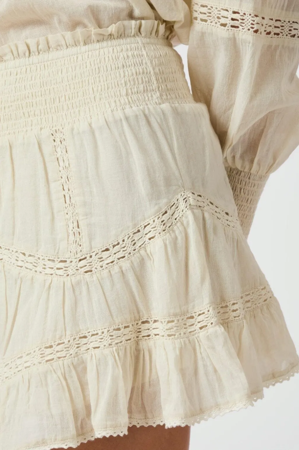 Lys gul nederdel fra Neo Noir i let bomuldsvoile. Nederdelen har smock-elastik i taljen og er prydet med vandrette blondedetaljer gennem hele designet.