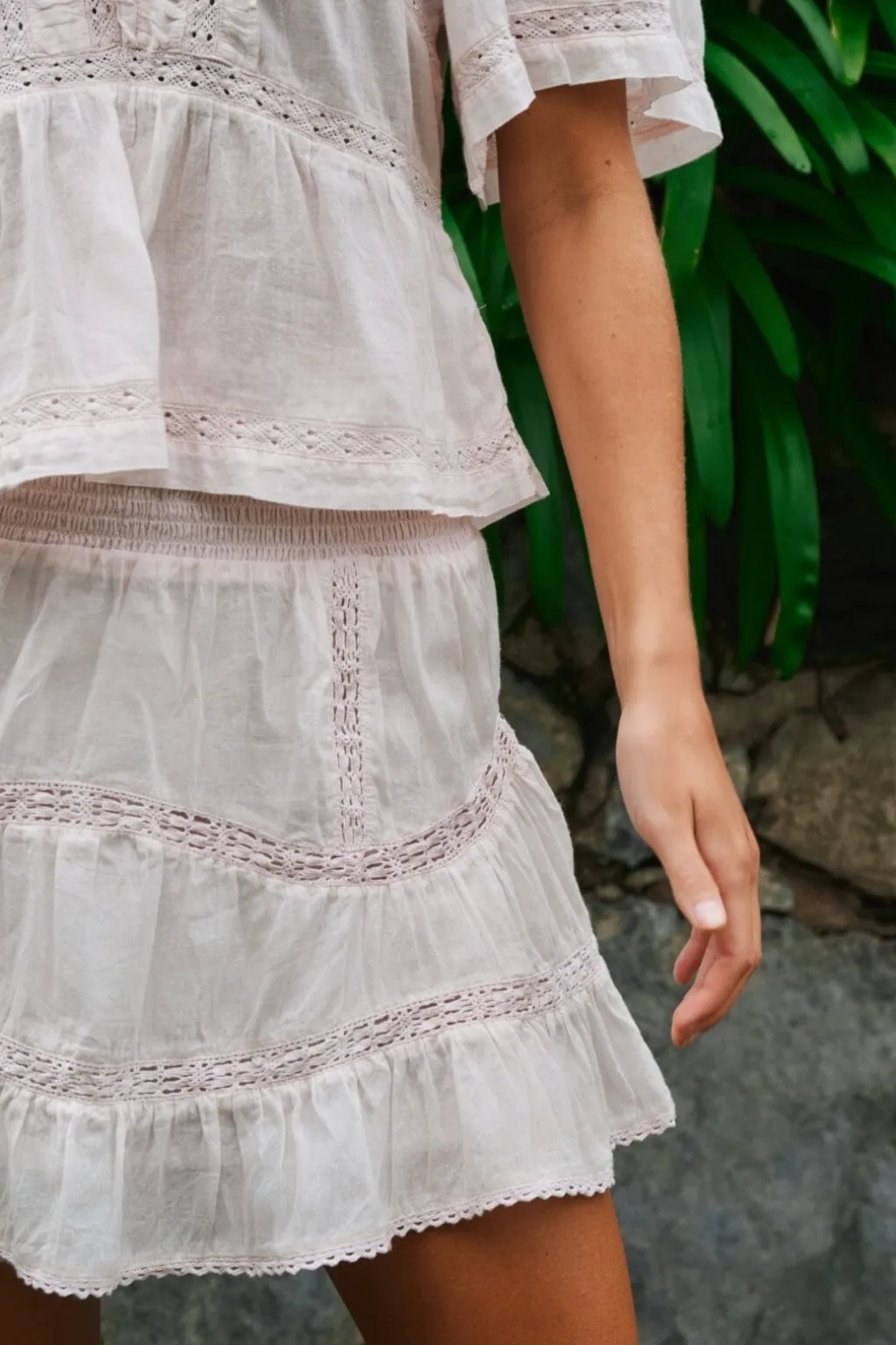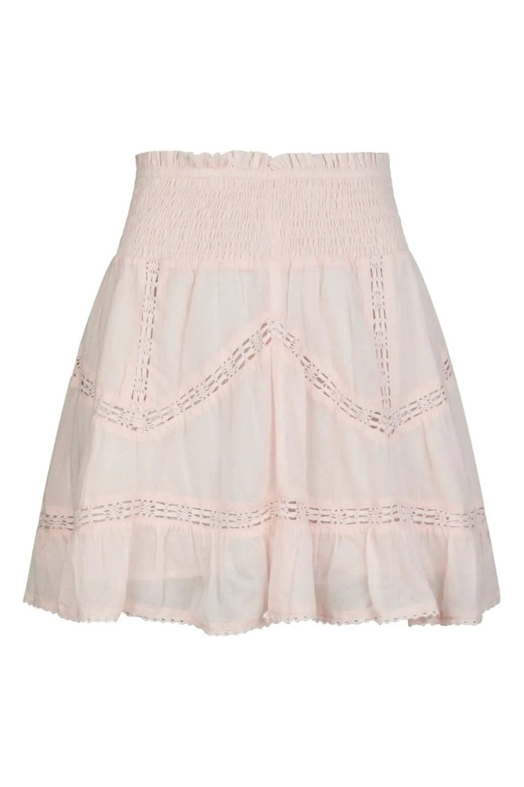 Lys pink nederdel fra Neo Noir med flæser og elastisk talje. Fremstillet i blød bomuldsvoile, der giver et let og luftigt udtryk.