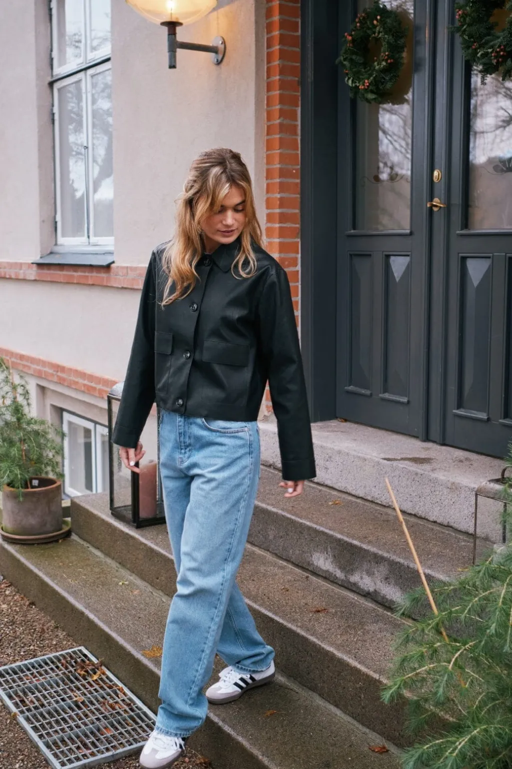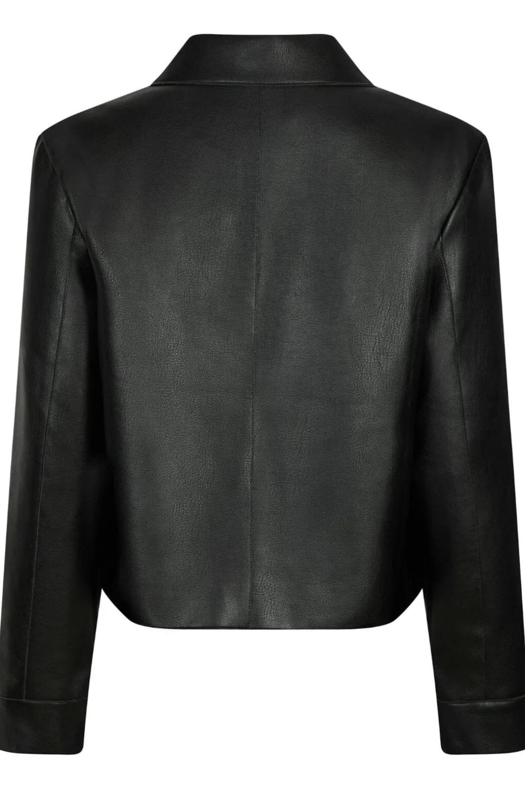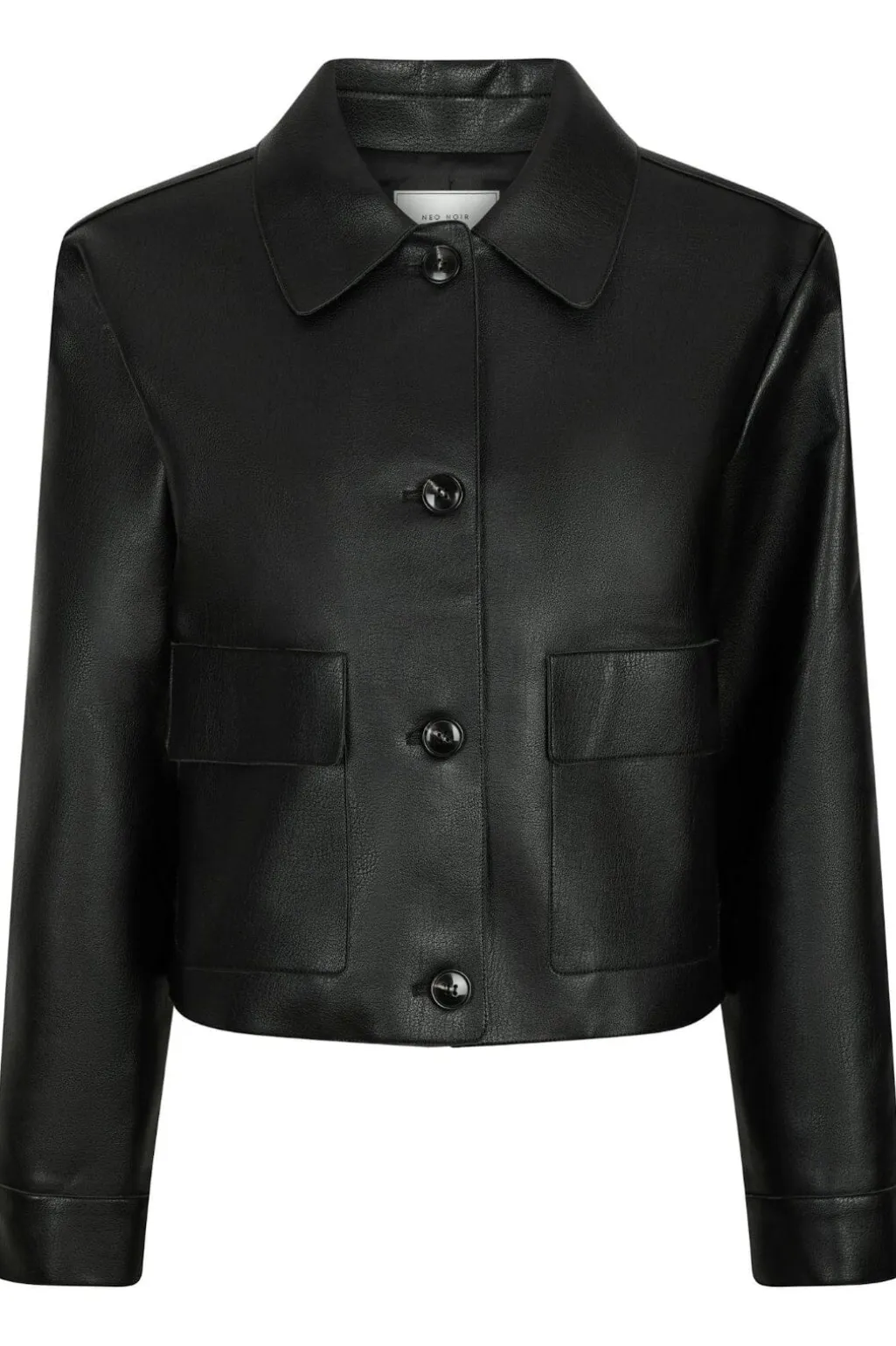Sort jakke i imiteret læder med skjortekrave fra Neo Noir. Jakken har et cropped design med knapper på forsiden og to praktiske lommer.