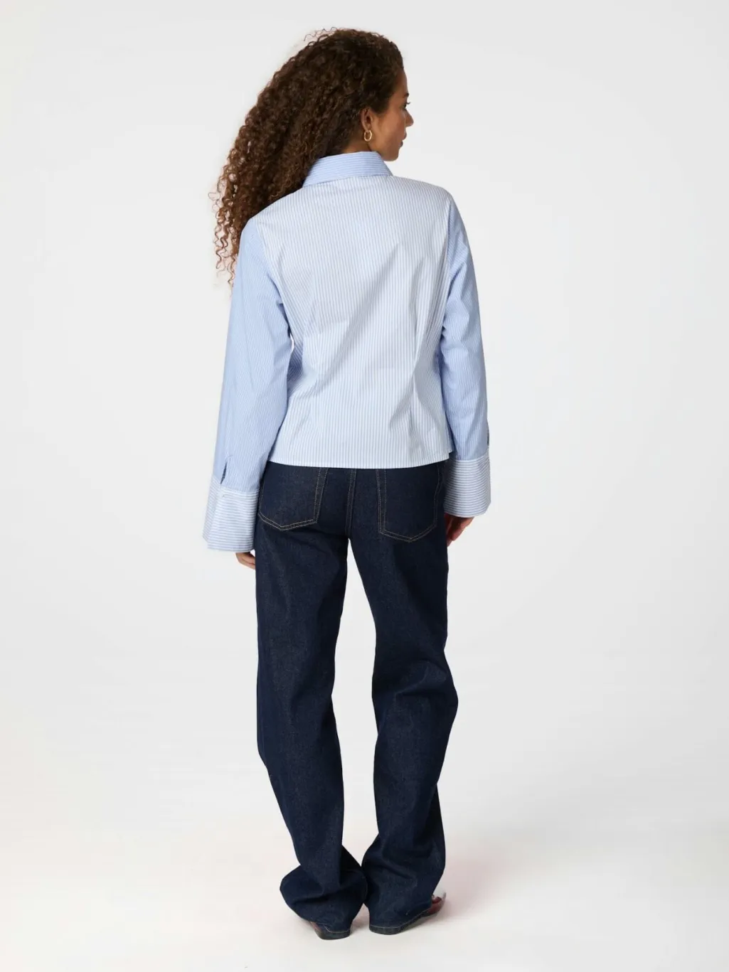 Lyseblå skjorte fra Neo Noir med to forskellige stribemønstre. Skjorten har en kropsnær pasform og en klassisk skjortekrave med knapper hele vejen ned.
