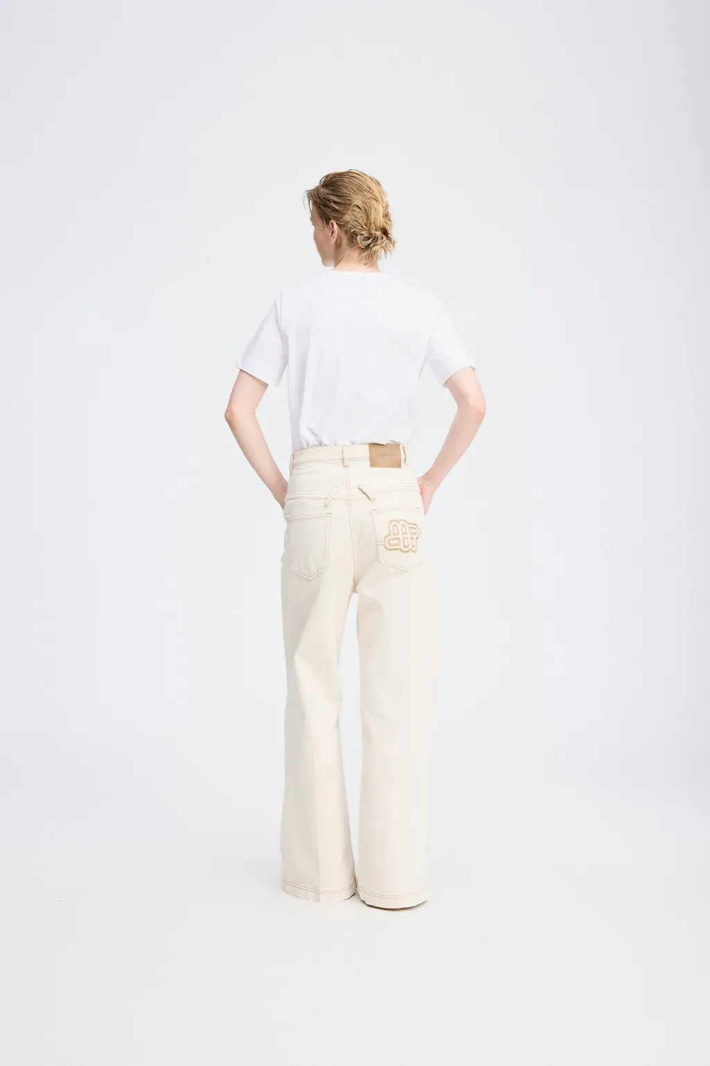 Højtaljede bukser fra Munthe i råhvid denim. Bukserne har brede ben og dobbelt knaplukning foran. Et broderet emblem pryder baglommen.