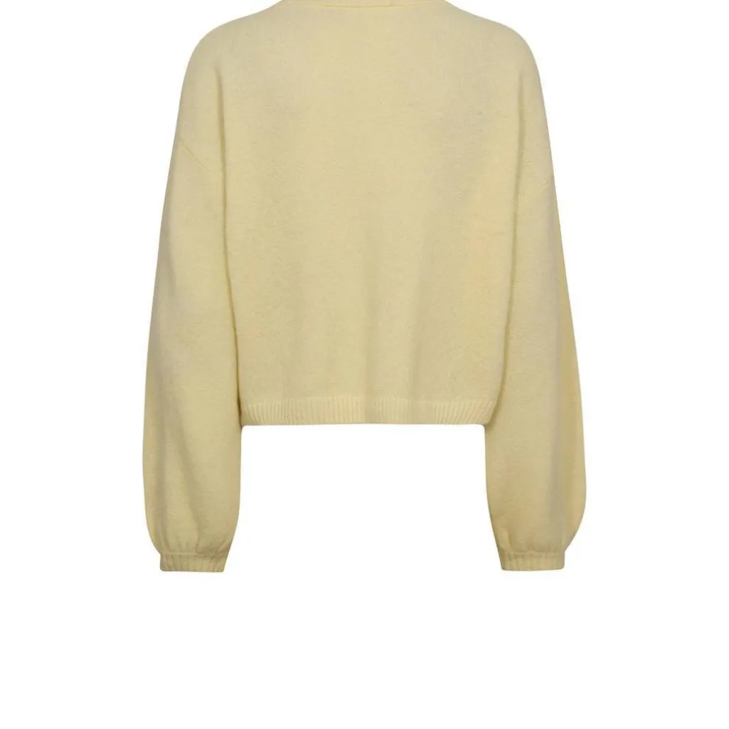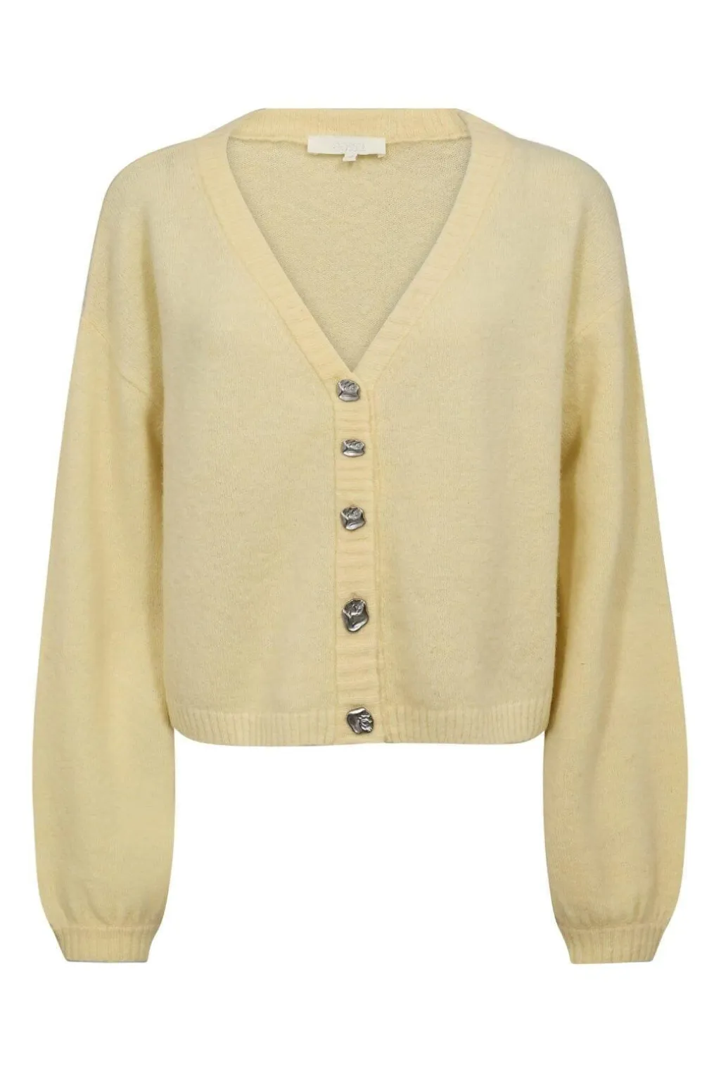 En lys gul cardigan fra Gossia med V-hals og seks knapper foran. Cardiganen har ribkanter ved ærmerne og forneden.