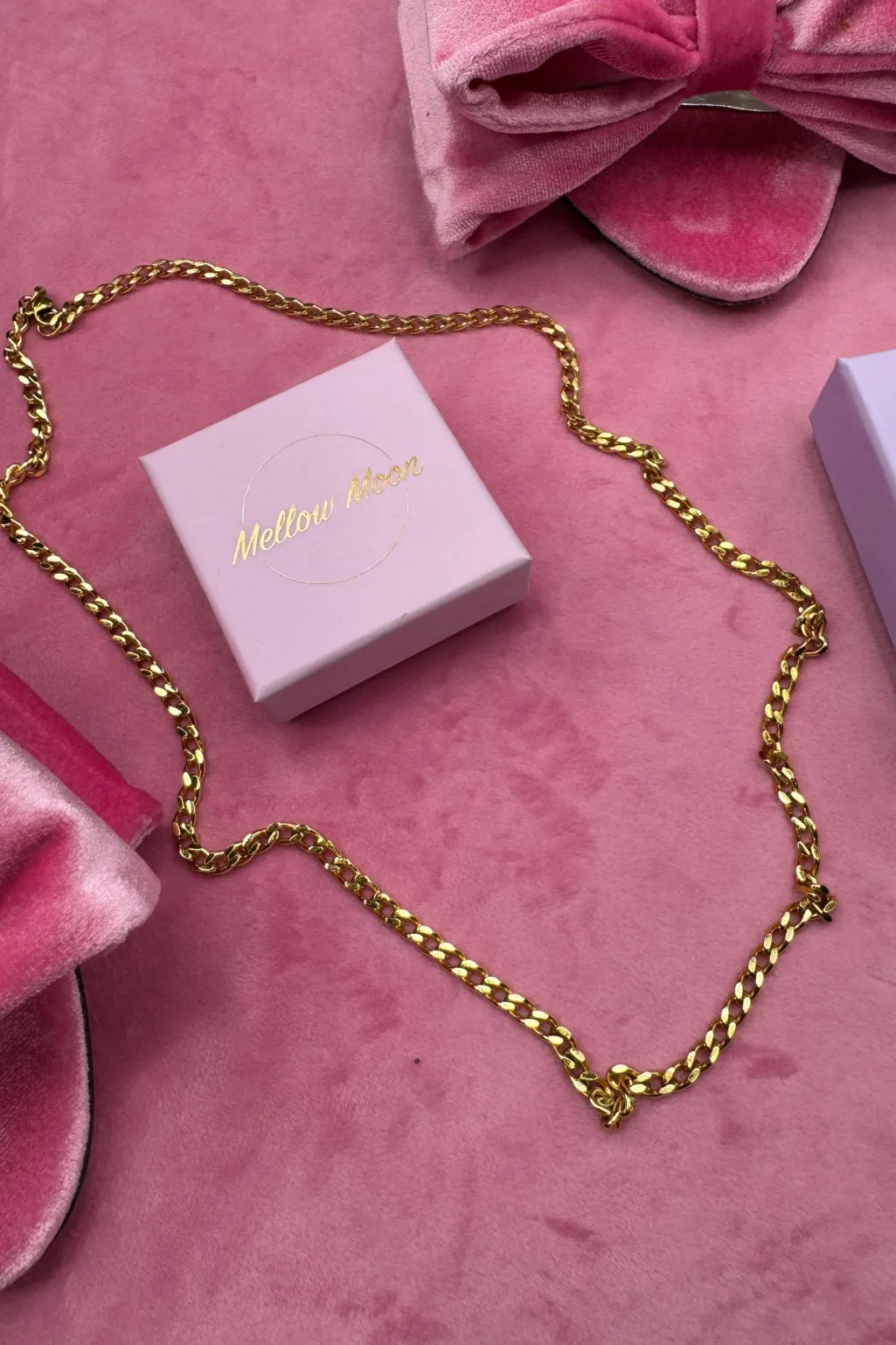 Forgyldt halskæde fra Mellow Moon med palm tree mesh-mønster. Halskæden er lavet af rustfrit stål med en gylden overflade og har en klassisk kædeform.