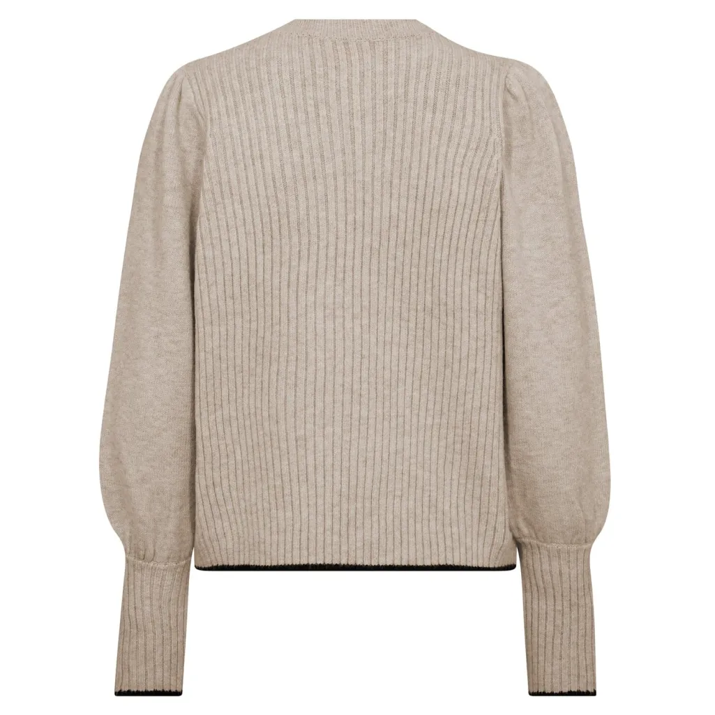 Striktrøje fra Co´Couture i creme med en ribbet struktur gennem hele trøjen. Den har puffede ærmer og en rund halsudskæring samt sorte kanter ved søm og manchetter.