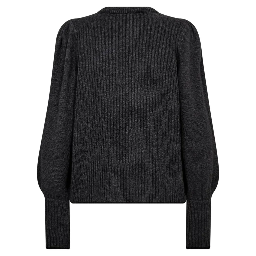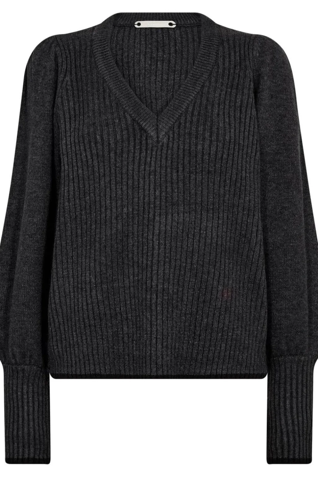 Mørkegrå striktrøje fra Co´Couture med ribbet tekstur og V-udskæring. Trøjen har lange ærmer med pufdetaljer ved skuldrene og ribbede manchetter.